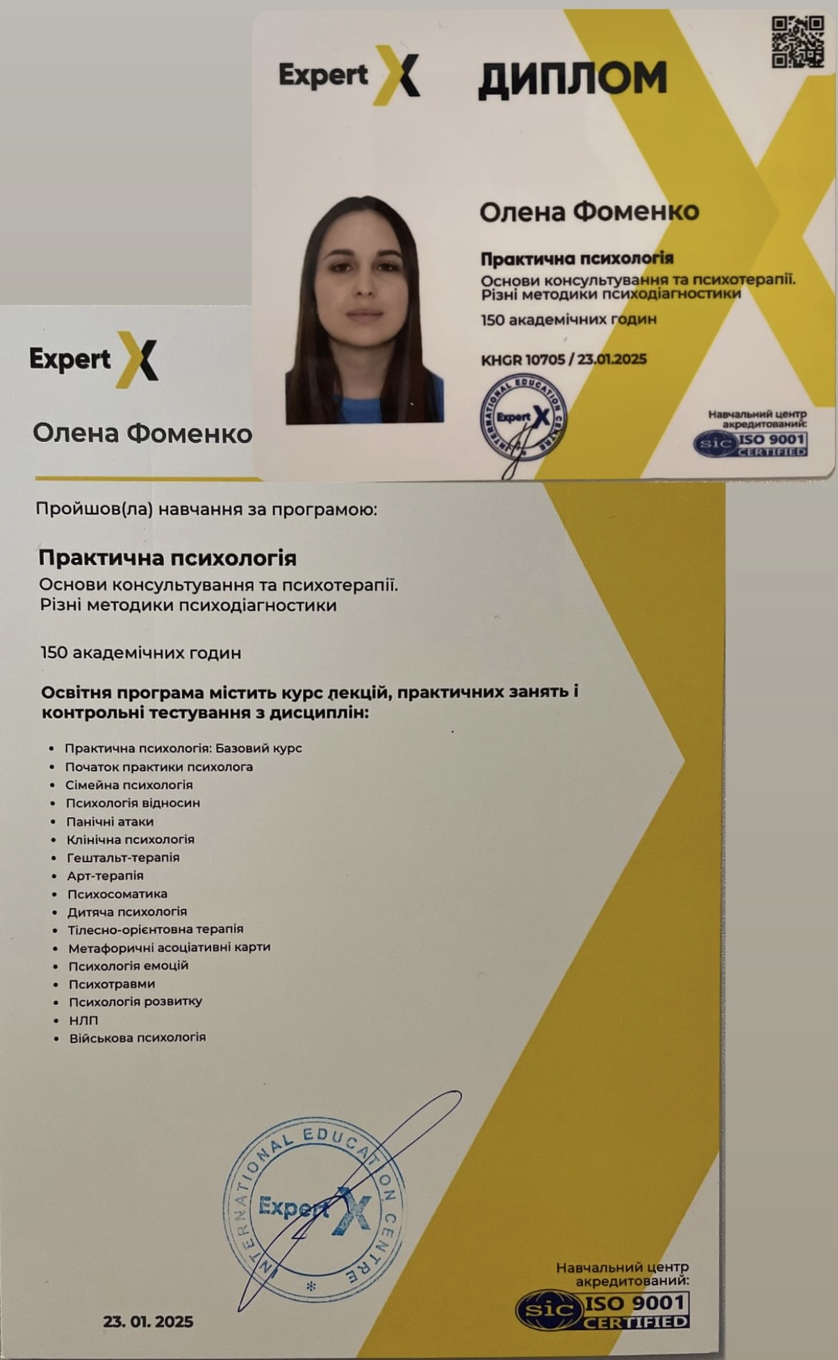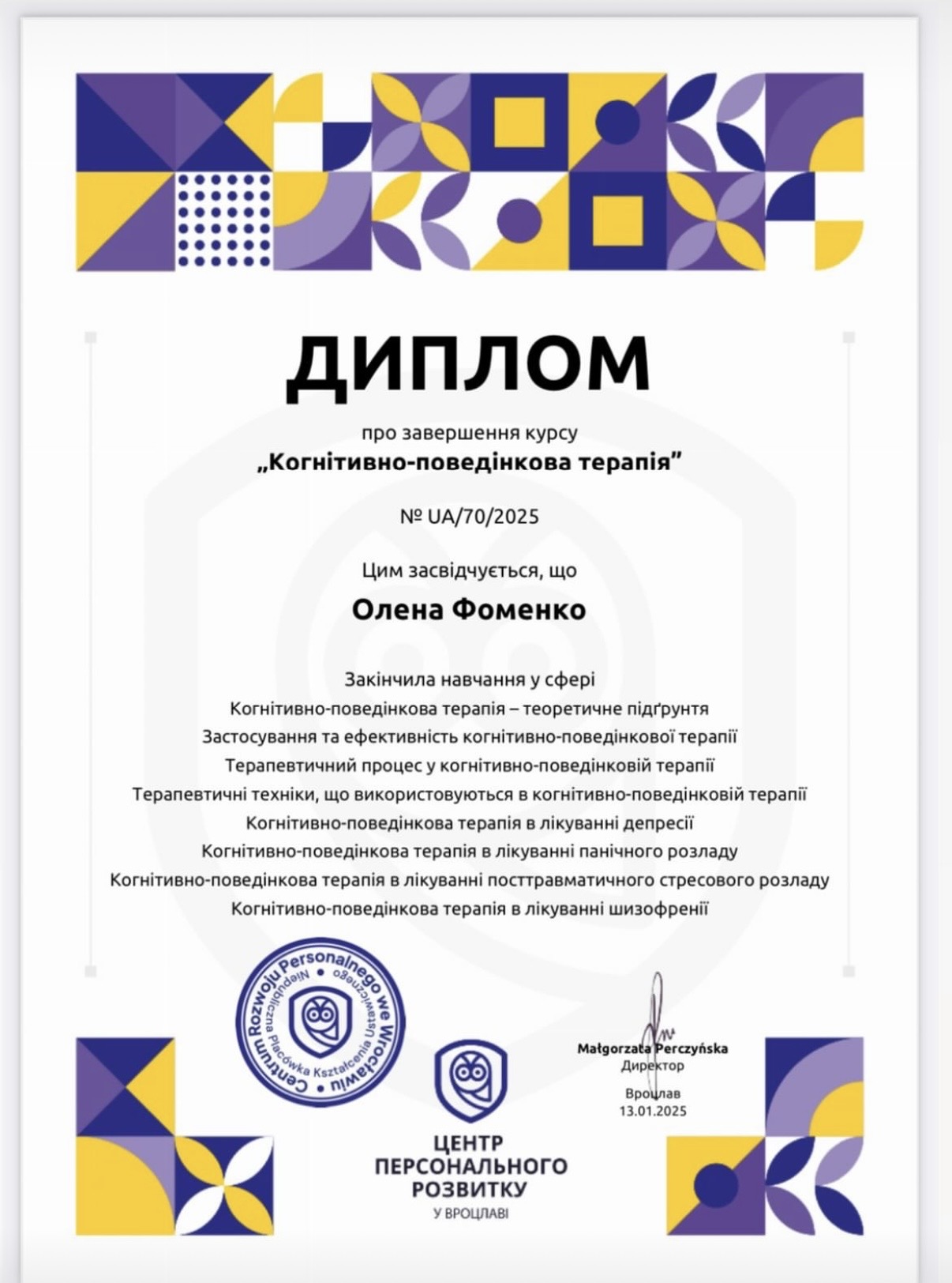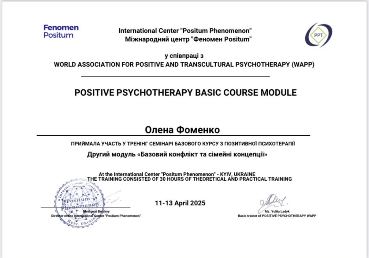 - Сертифікат Базовий консультант у методі позитивної психотерапії (Європейська сертифікація WAPP), Fenomen Positum з 2026 року