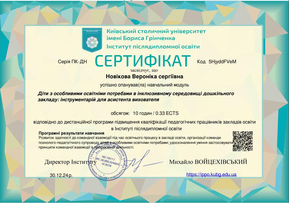 - Сертифікат Діти з особливими освітніми потребами в інклюзивному середовищі дошкільного закладу:інструментарій для асистента вихователя з 2024 року