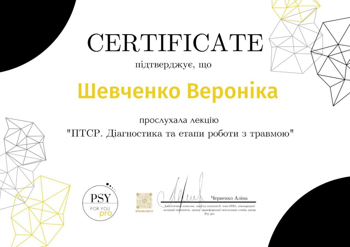 - Сертифікат ПТСР. Діагностика та етапи роботи з травмою з 2024 року