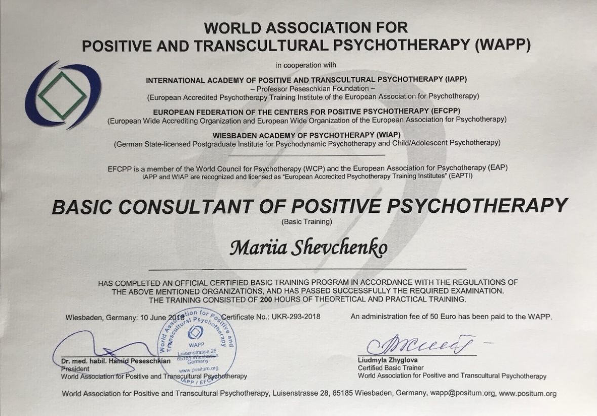 - Сертифікат Сертифікат консультанта в методі Позитивної психотерапії з 2018 року