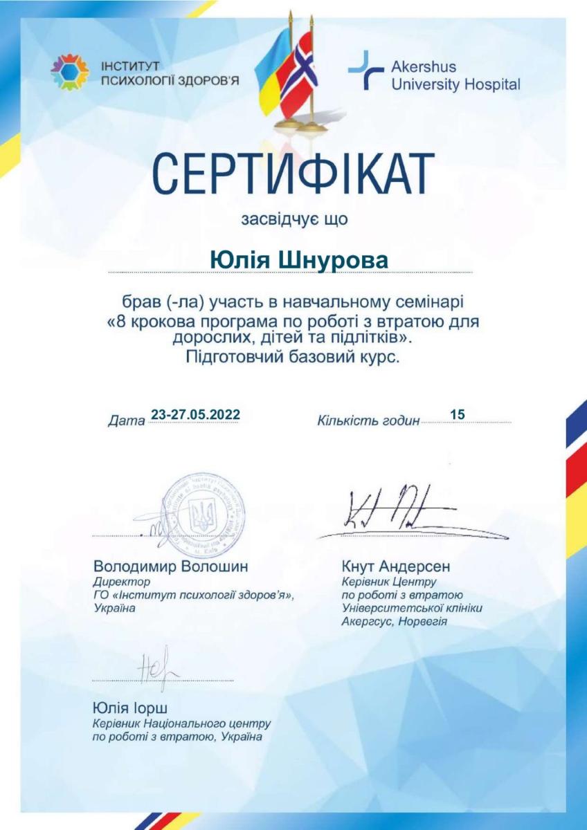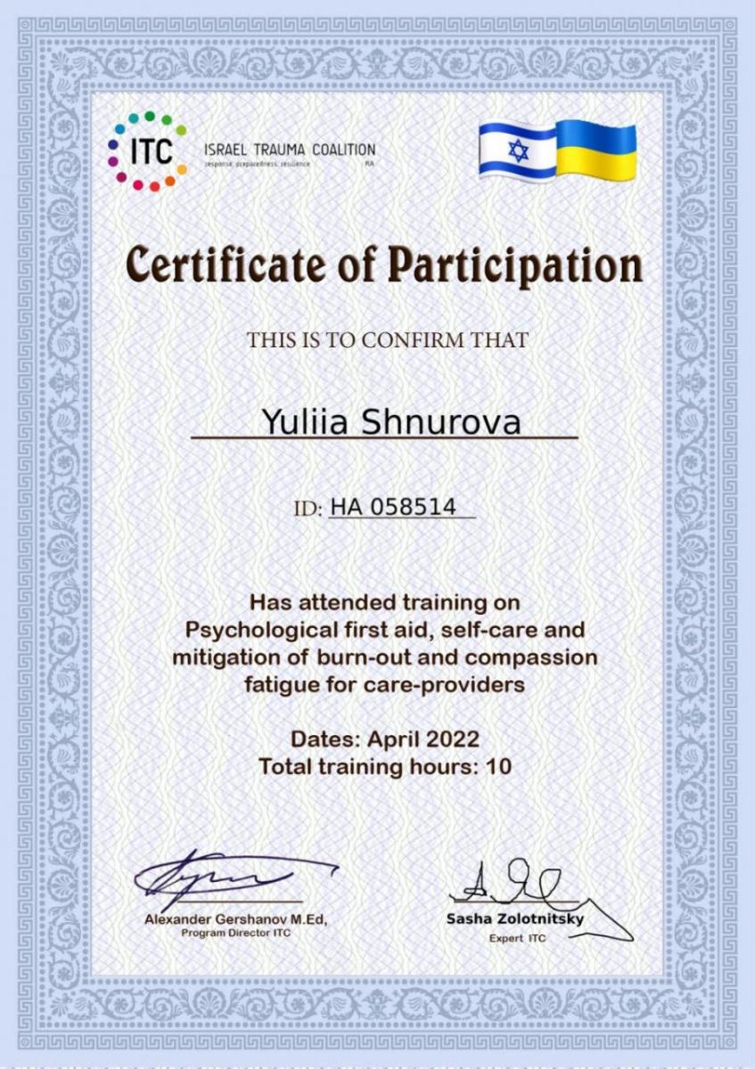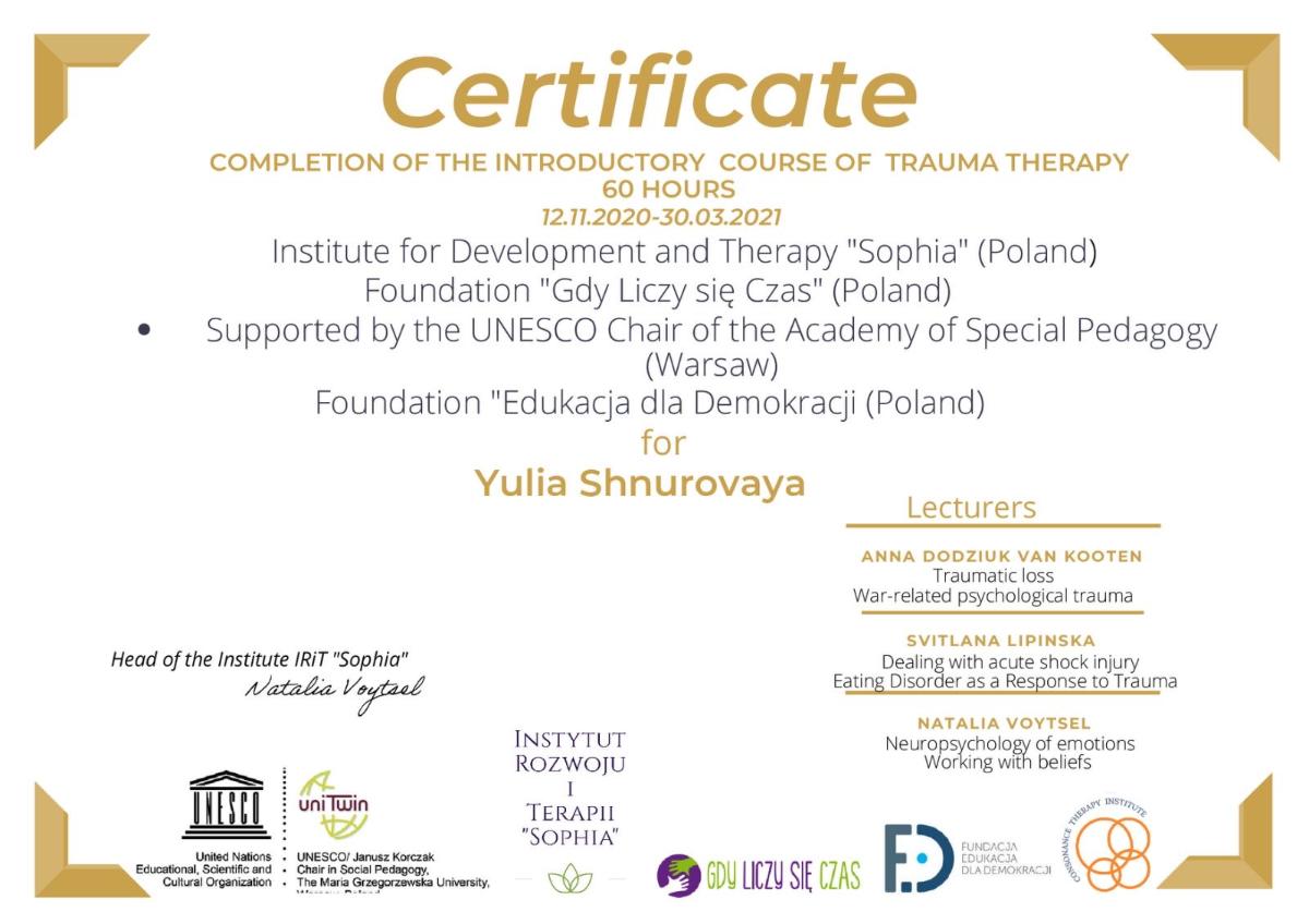 - Сертифікат «Вводный курс терапия травмы» Instytut Rozwoju i Terapii "Sophia", Fundacja Gdy Liczy się Czas, Fundacja Educacja dla democracji, UNESCO Chair of Academy of Special Pedagogy (Poland) з 2021 року