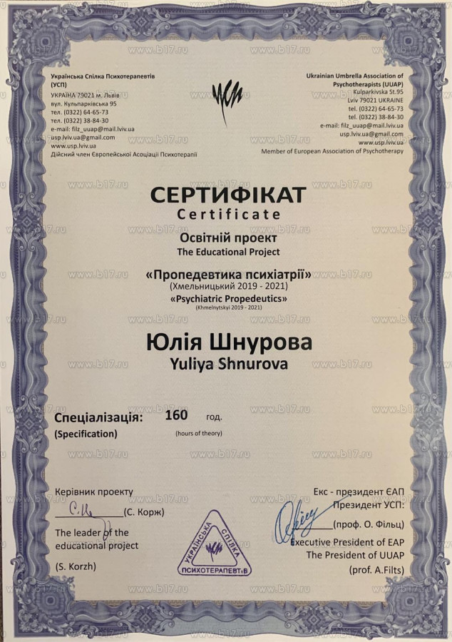 - Сертифікат «Пропедевтика психіатрії» (Хмельницький, 160 годин) з 2020 року