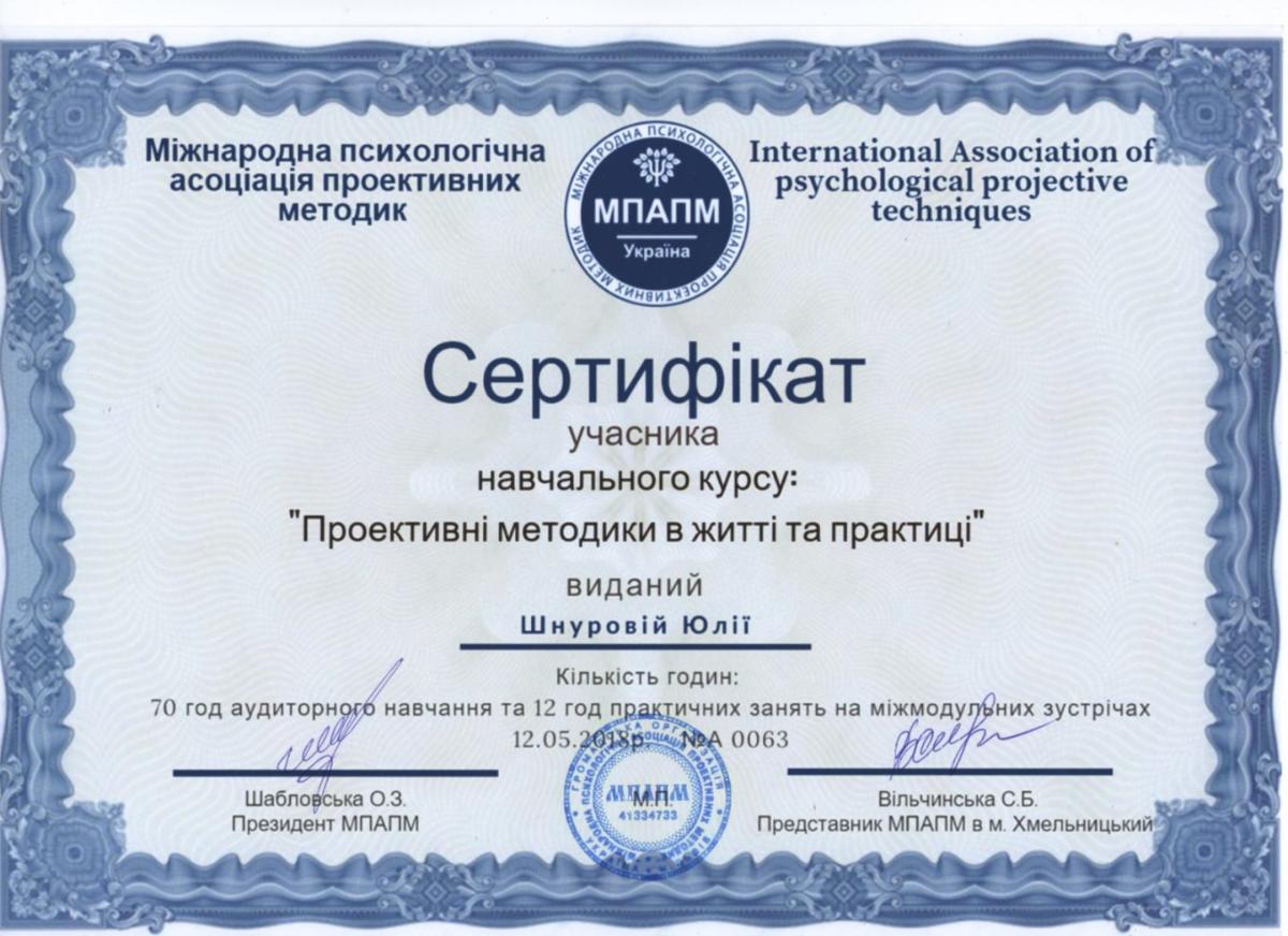 - Сертифікат «Проективні методики в житті та практиці» на базі Міжнародної психологічної асоціації проективних методик. з 2019 року