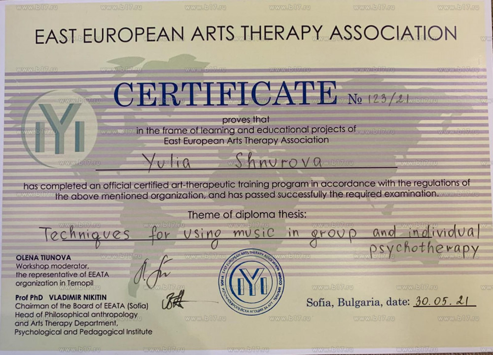 - Сертифікат Арттерапевтка — Європейська асоціація арттерапії, EEATA (Болгарія) з 2022 року
