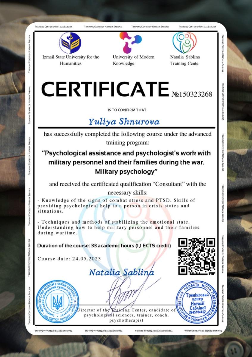 - Сертифікат Консультантка з військової психології — Тренінговий центр Наталії Сабліної з 2023 року
