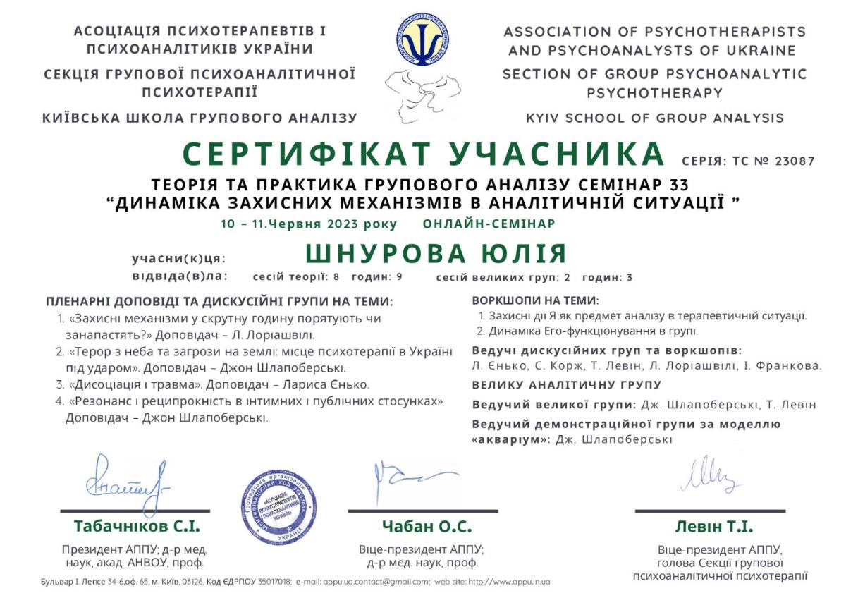 - Сертифікат «Сучасна психокорекція» за напрямом «Груповий психоаналіз» на базі секції групової психоаналітичної психотерапії АППУ в рамках освітньої програми «ГРУПОВИЙ АНАЛІЗ» (м. Київ) з 2021 року