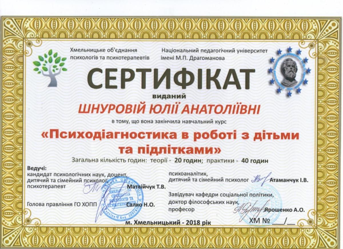 - Сертифікат «Психодіагностика в роботі з дітьми та підлітками» 60 годин. НПУ ім. Драгоманова. з 2019 року