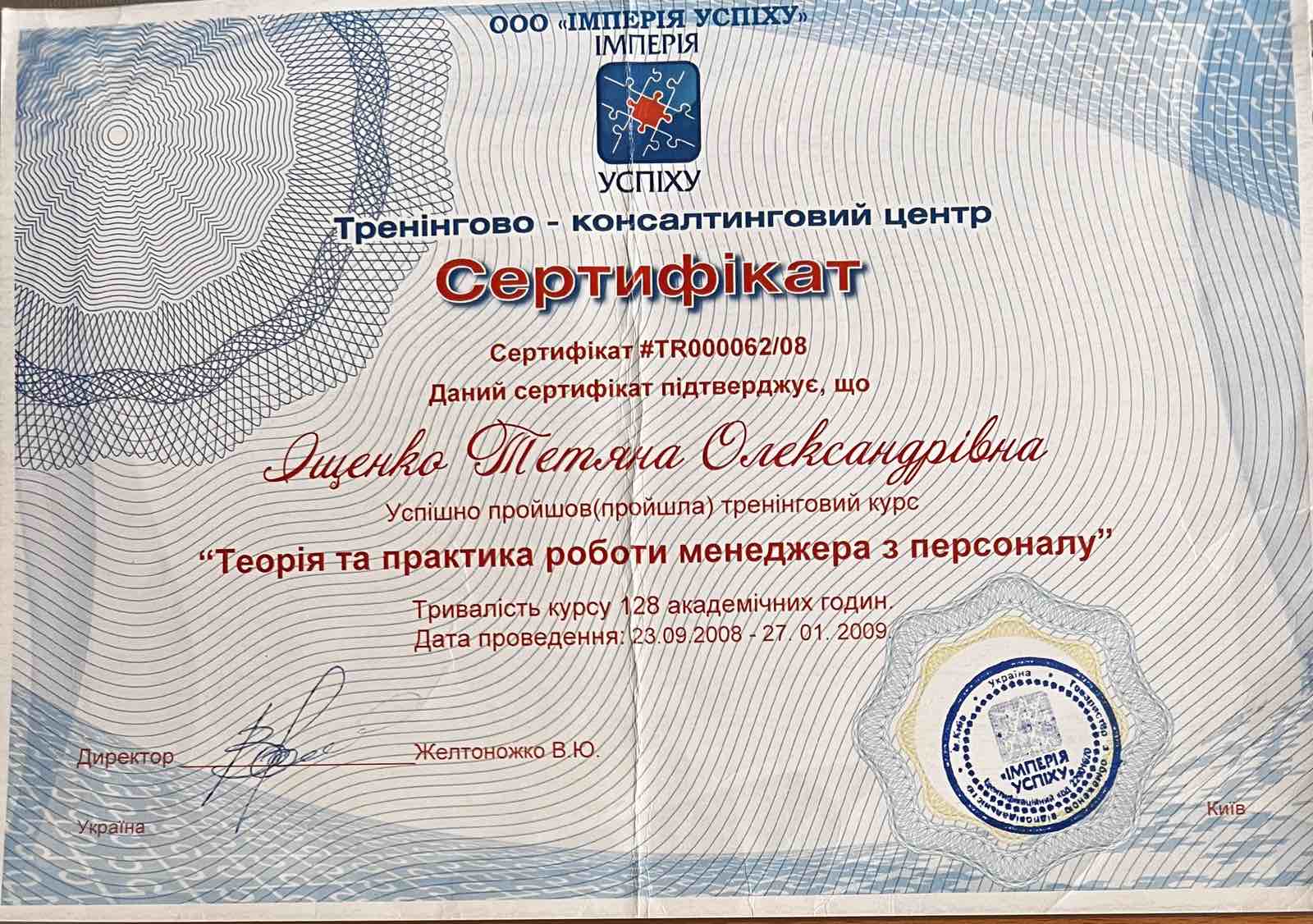 - Сертифікат Теорія та практика менеджера з персоналу з 2009 року