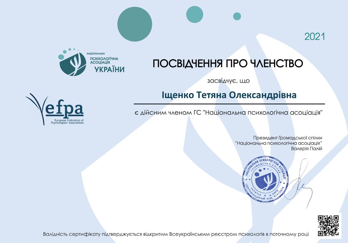 - Сертифікат Національна психологічна асоціація України Посвідчення про членство з 2021 року