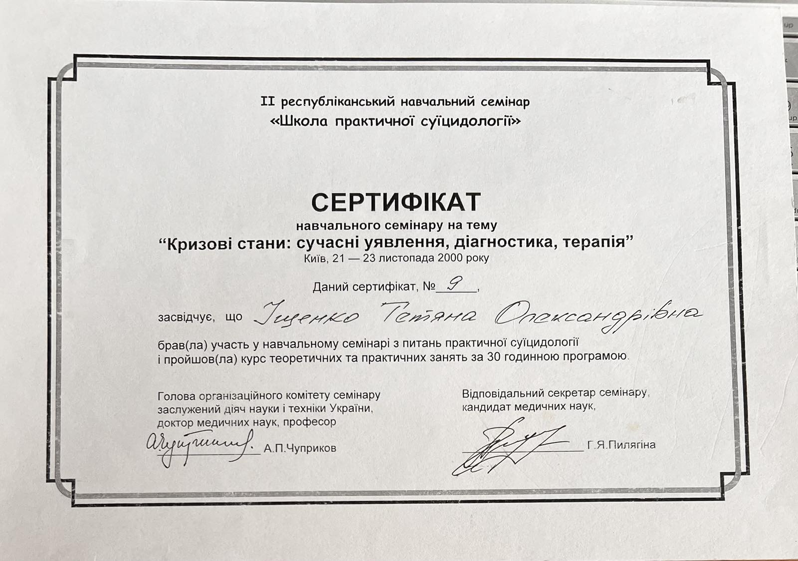 - Сертифікат Кризові стани: сучане уявлення, діагностика, терапія з 2000 року
