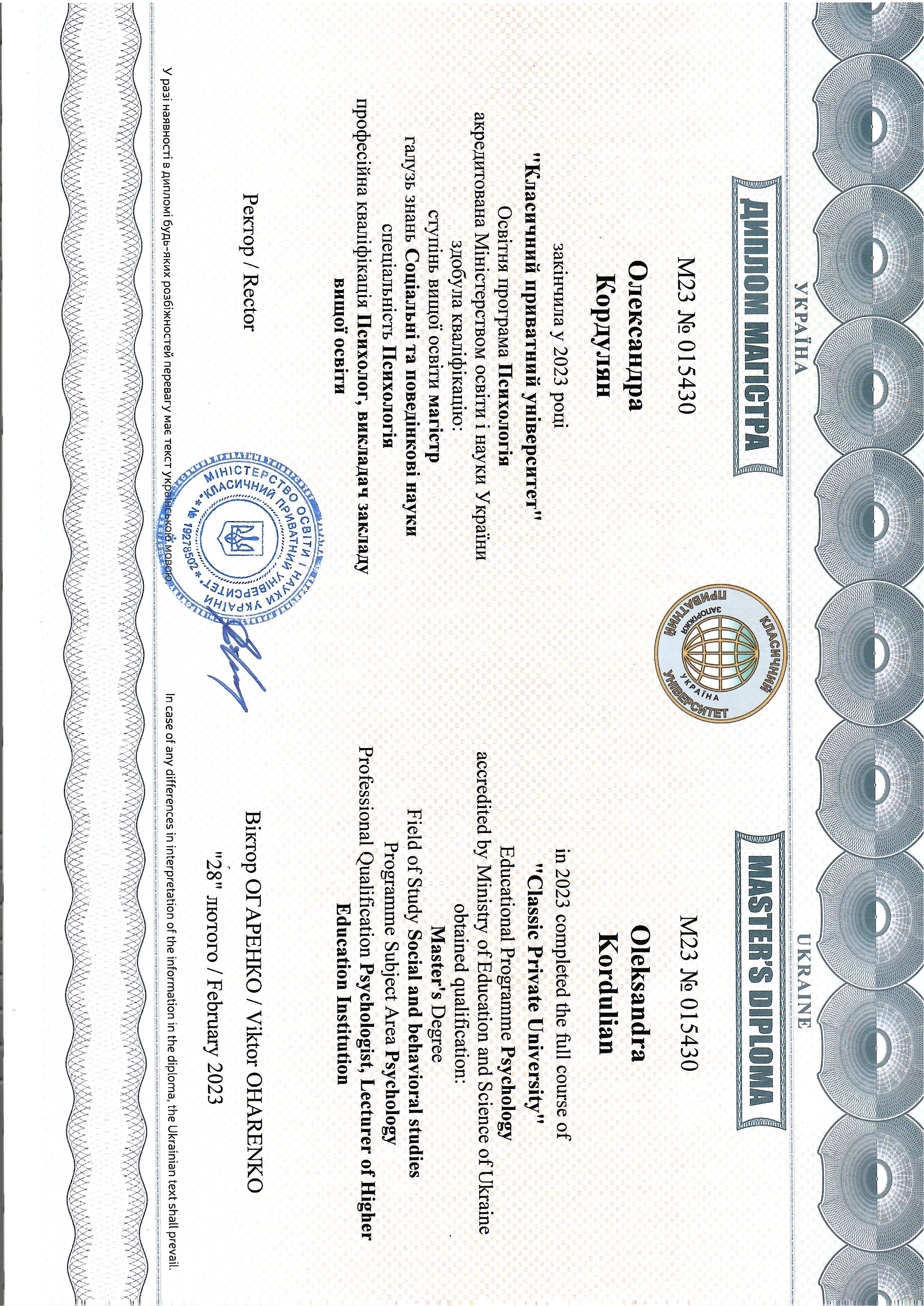 - Сертифікат Когнітивно-поведінковий підхід в психологічному консультуванні з 2024 року