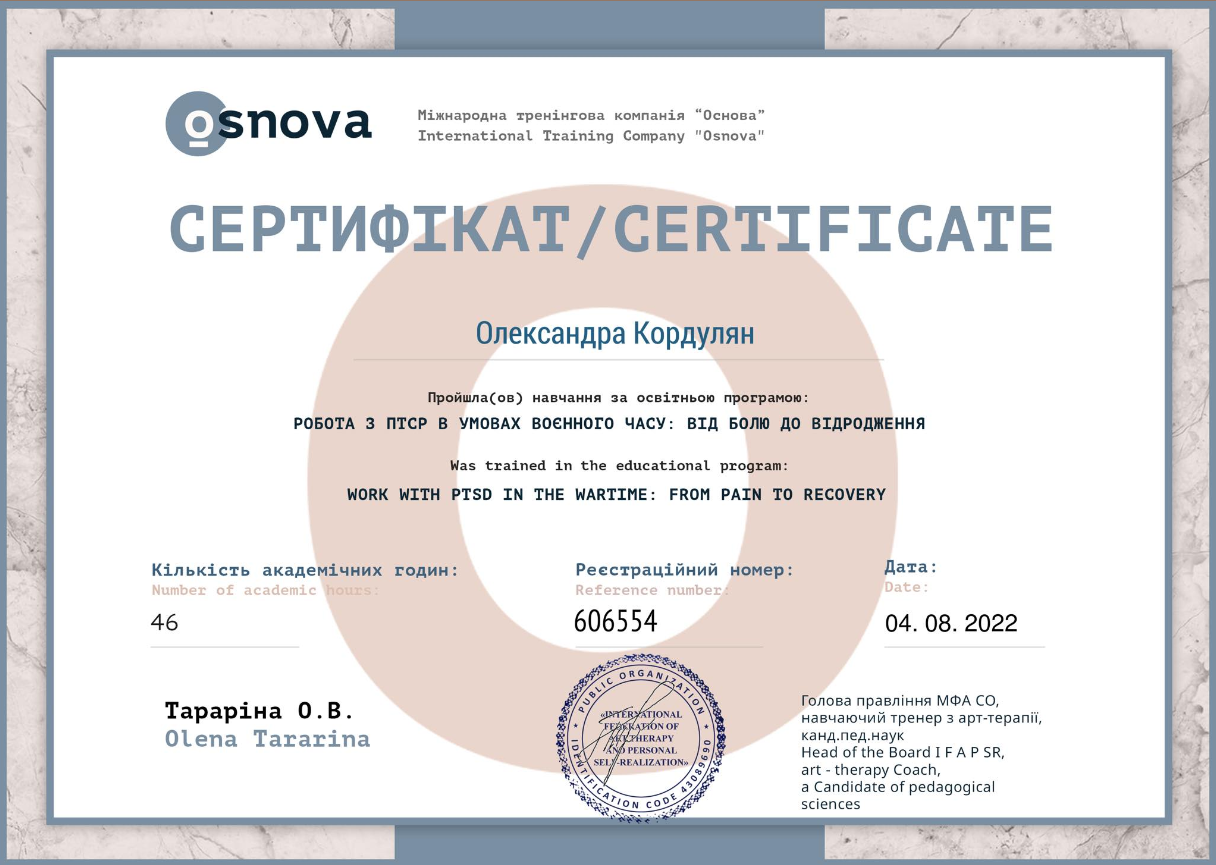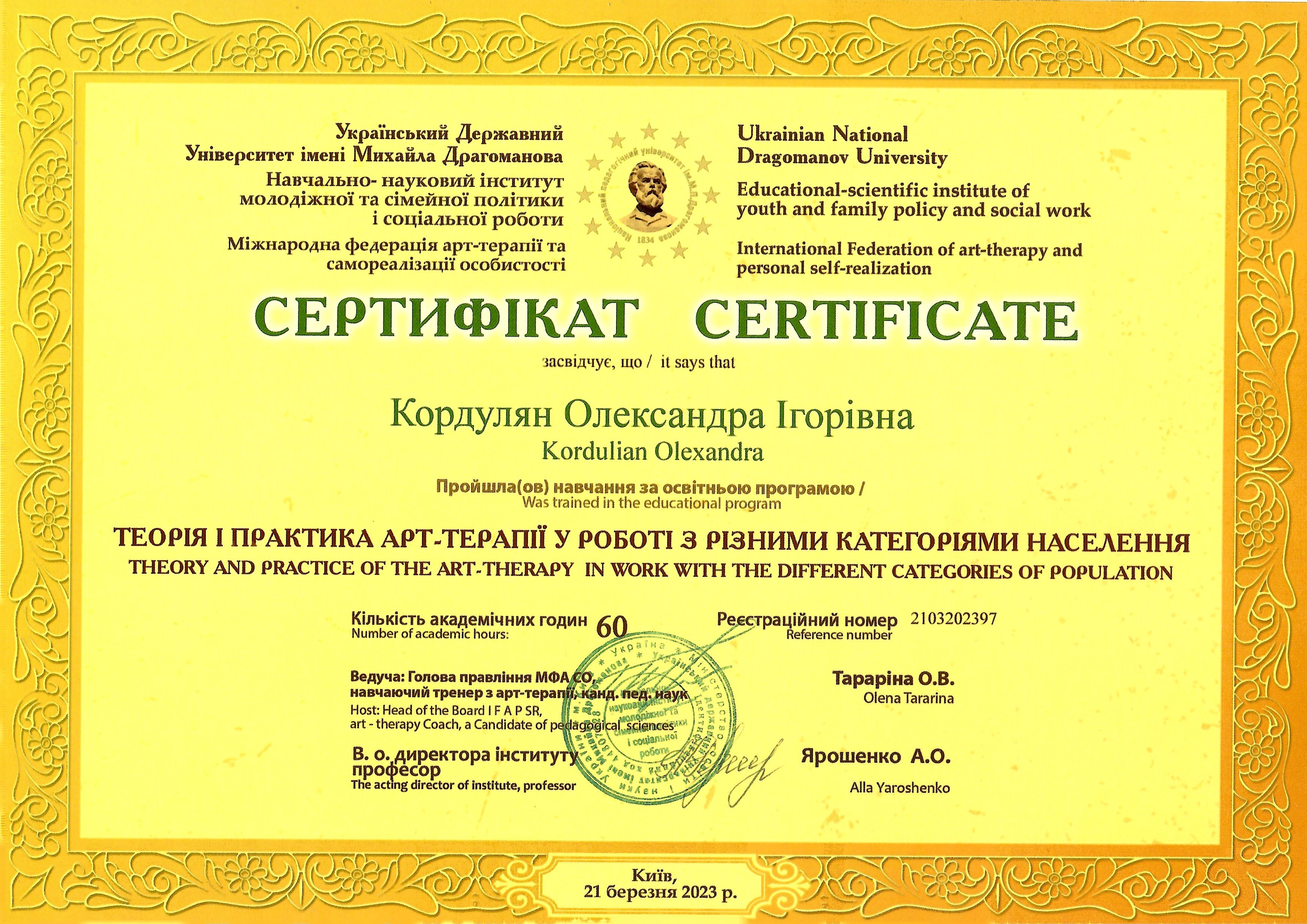 - Сертифікат Теорія і практика арт-терапії у роботі з різними категоріями населення з 2023 року