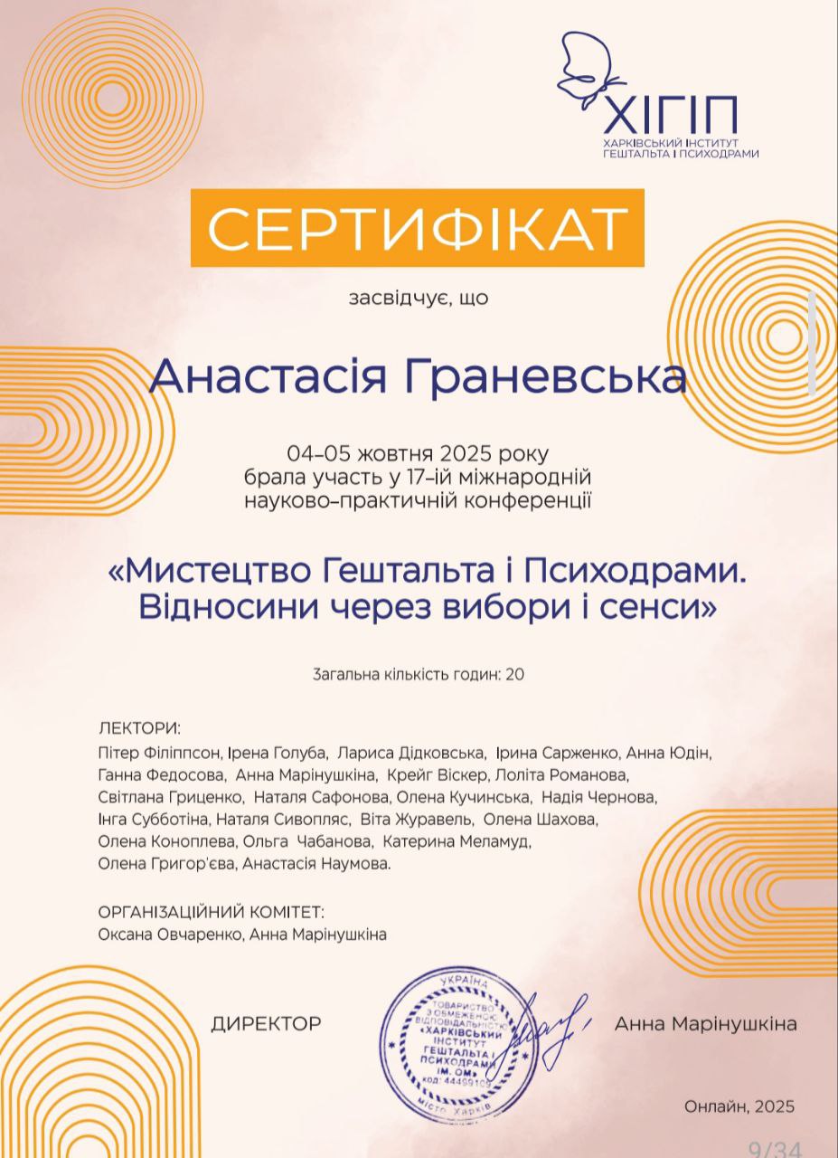 - Сертифікат Мистецтво гештальта і психодрами. Відносини через вибори і сенси з 2025 року