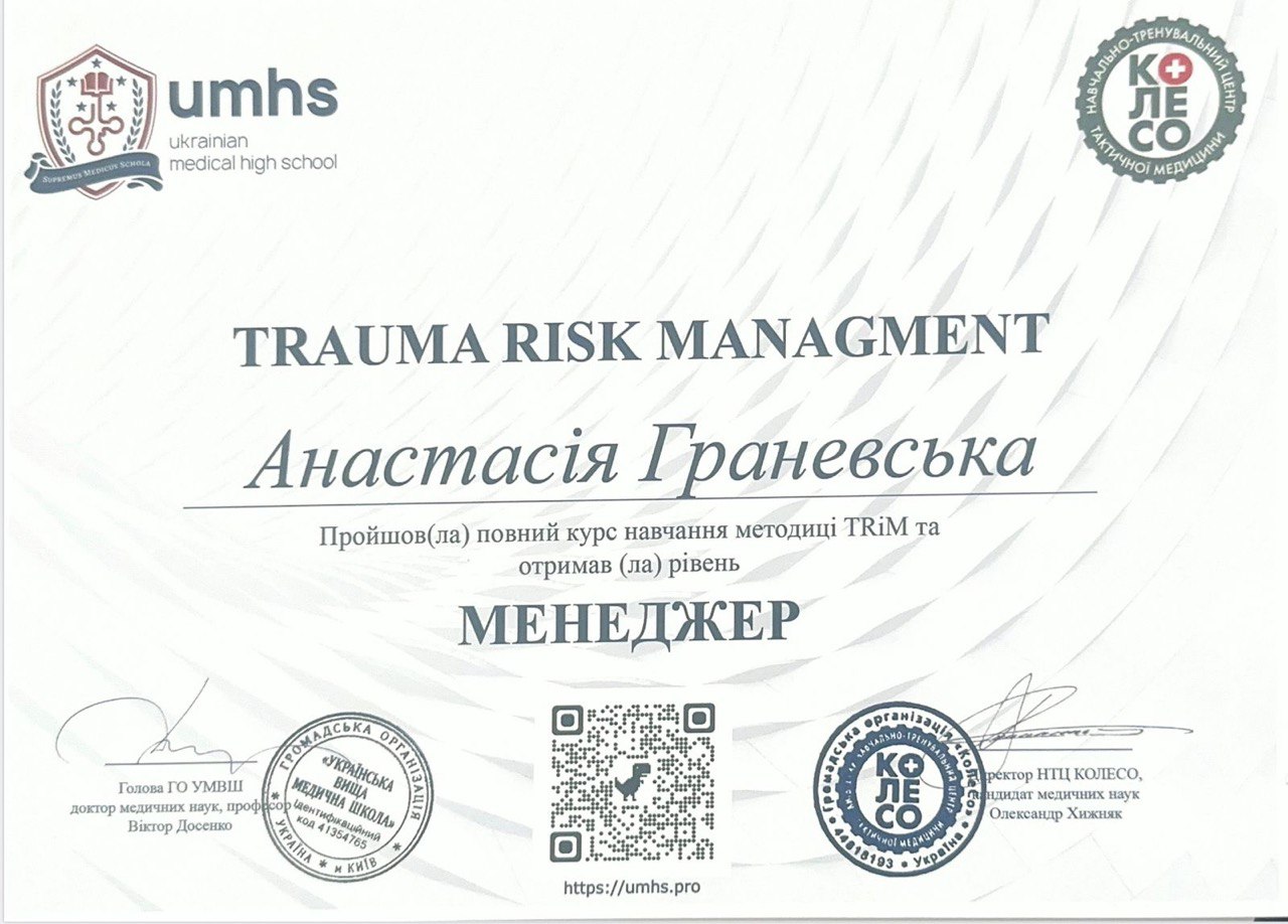 - Сертифікат TRiM (Trauma Risk Management), рівень: менеджер (ГО «Українська вища медична школа») з 2022 року
