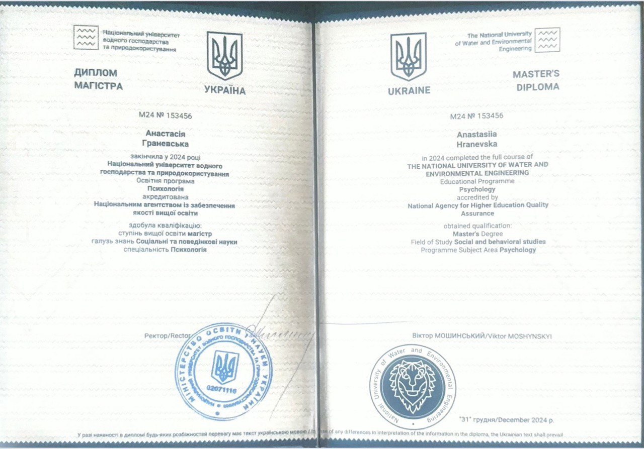- Магістр психології, Національний університет водного господарства та природокористування в 2024