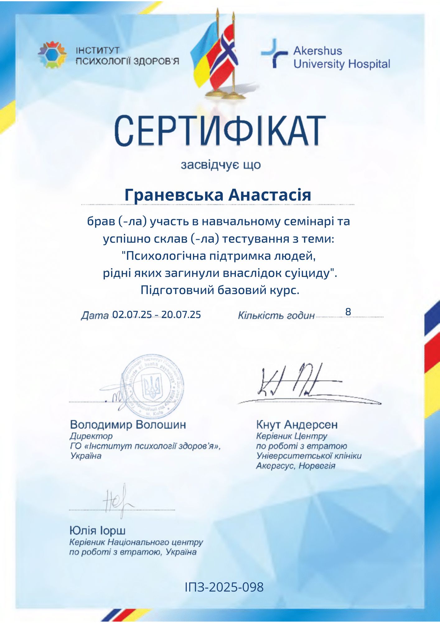 - Сертифікат психологічна підтримка людей рідні яких загинули внаслідок суїциду (інститут психології здоровʼя) з 2025 року