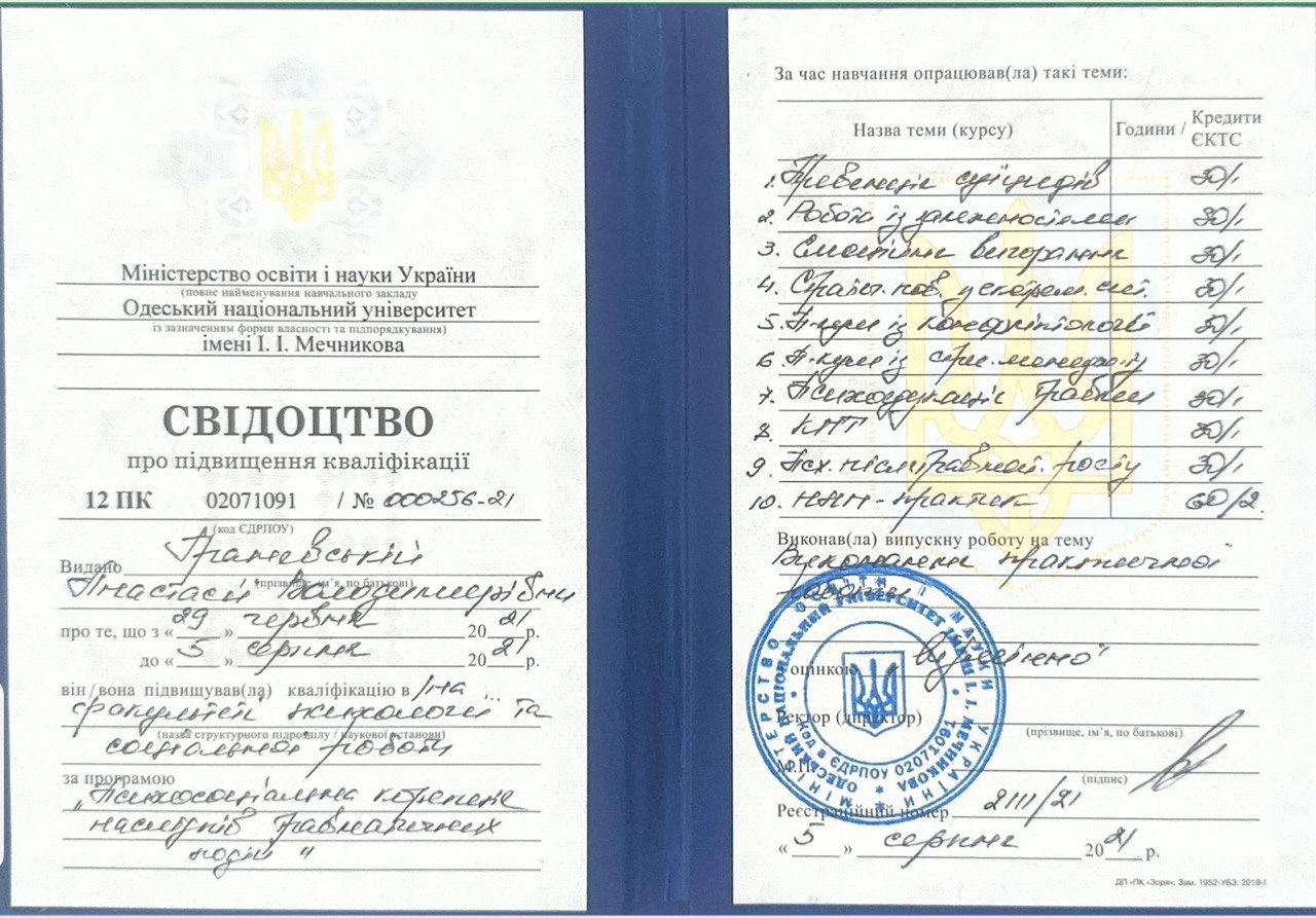 - Сертифікат Психосоціальна корекція наслідків травматичних подій (ОНУ ім. Мечникова) з 2021 року