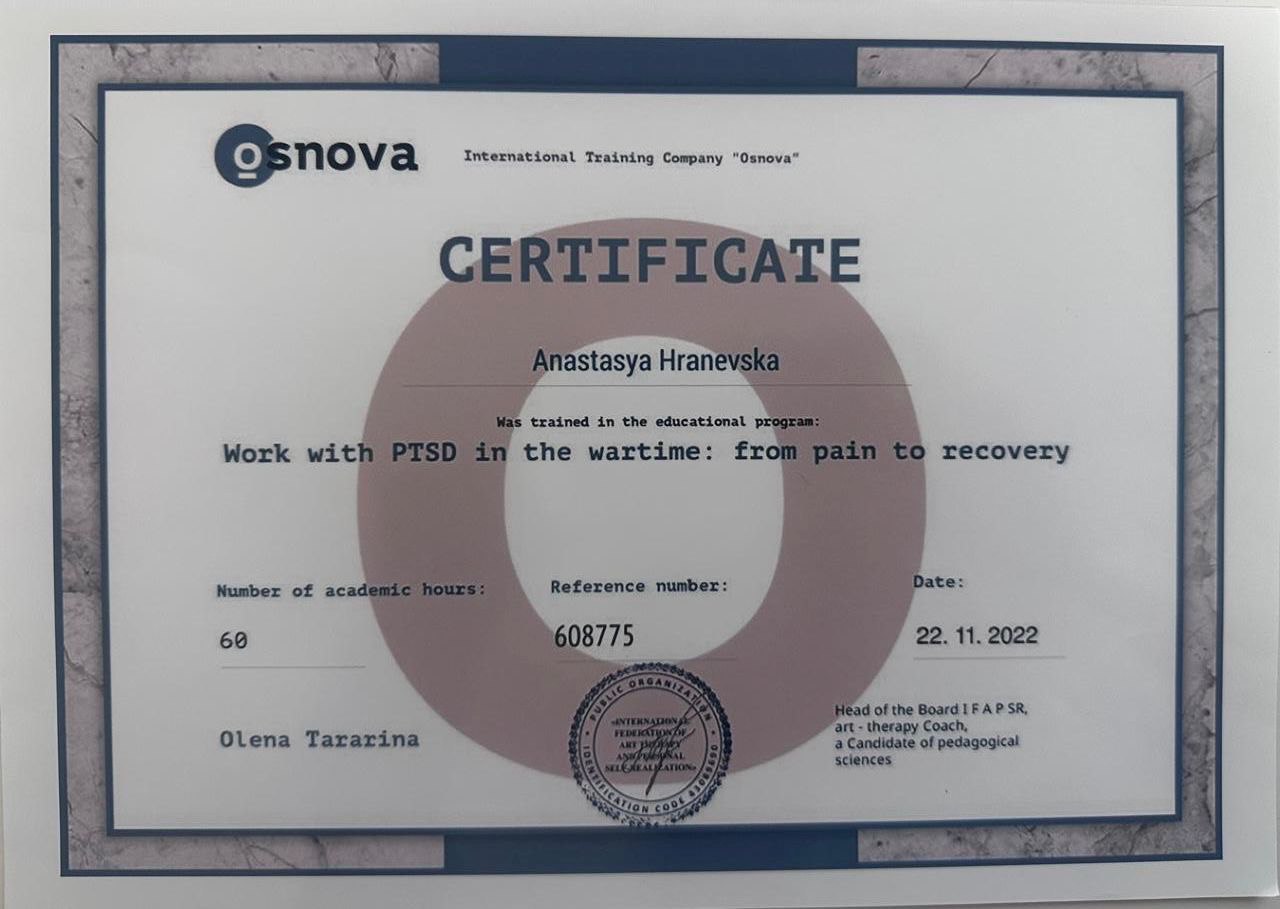 - Сертифікат Робота з ПТСР під час війни (Тренінговий центр «Основа») з 2022 року