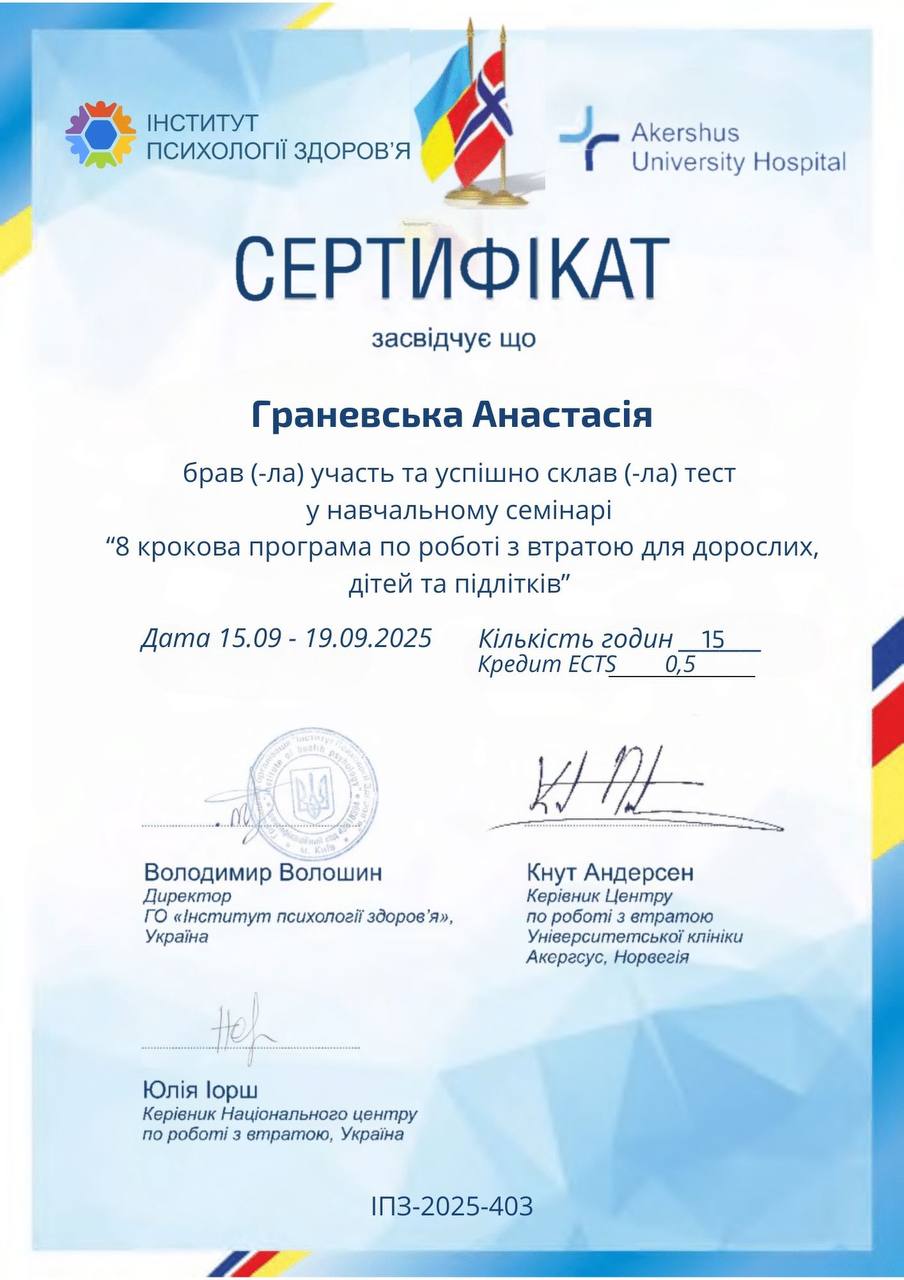 - Сертифікат 8 крокова програма по роботі з втратою для дорослих, дітей та підлітків з 2025 року