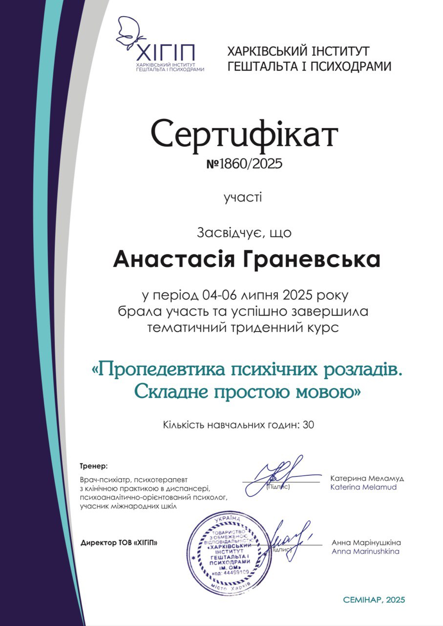 - Сертифікат пропедевтика психічних розладів (Харківський інститут гештальта і психодрами) з 2025 року