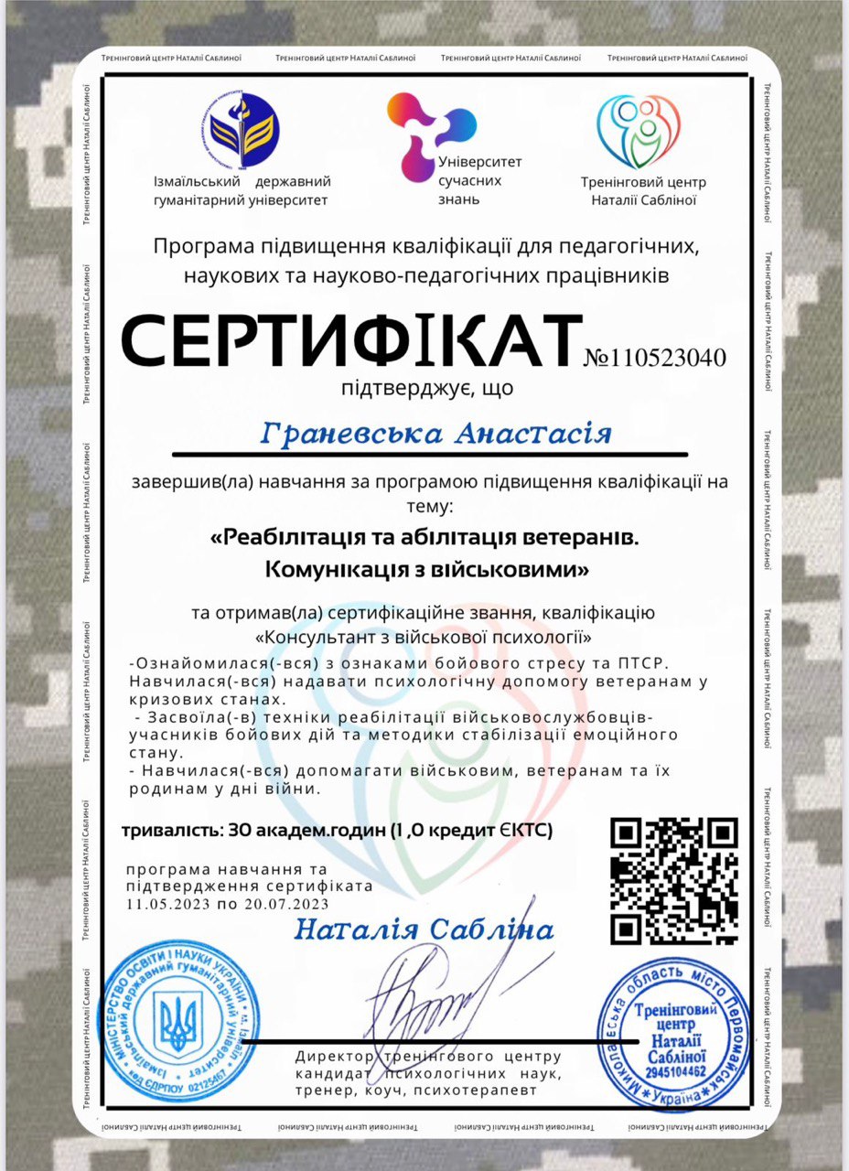 - Сертифікат Курс «Реабілітація та абілітація ветеранів. Комунікація з військовими» з 2023 року