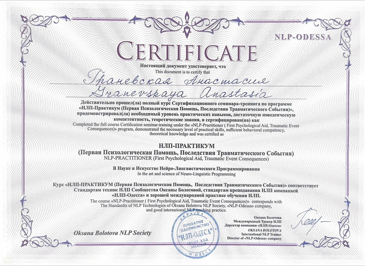 - Сертифікат Перша психологічна допомога. Наслідки травми (NLP Одеса) з 2021 року