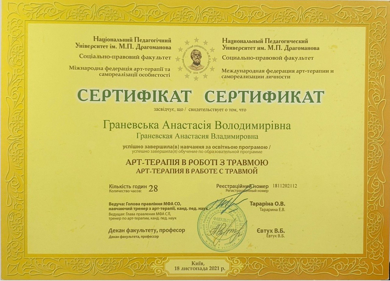 - Сертифікат Арт-терапія в роботі з травмою (НПУ ім. М. Драгоманова, тренер О. Тараріна) з 2021 року