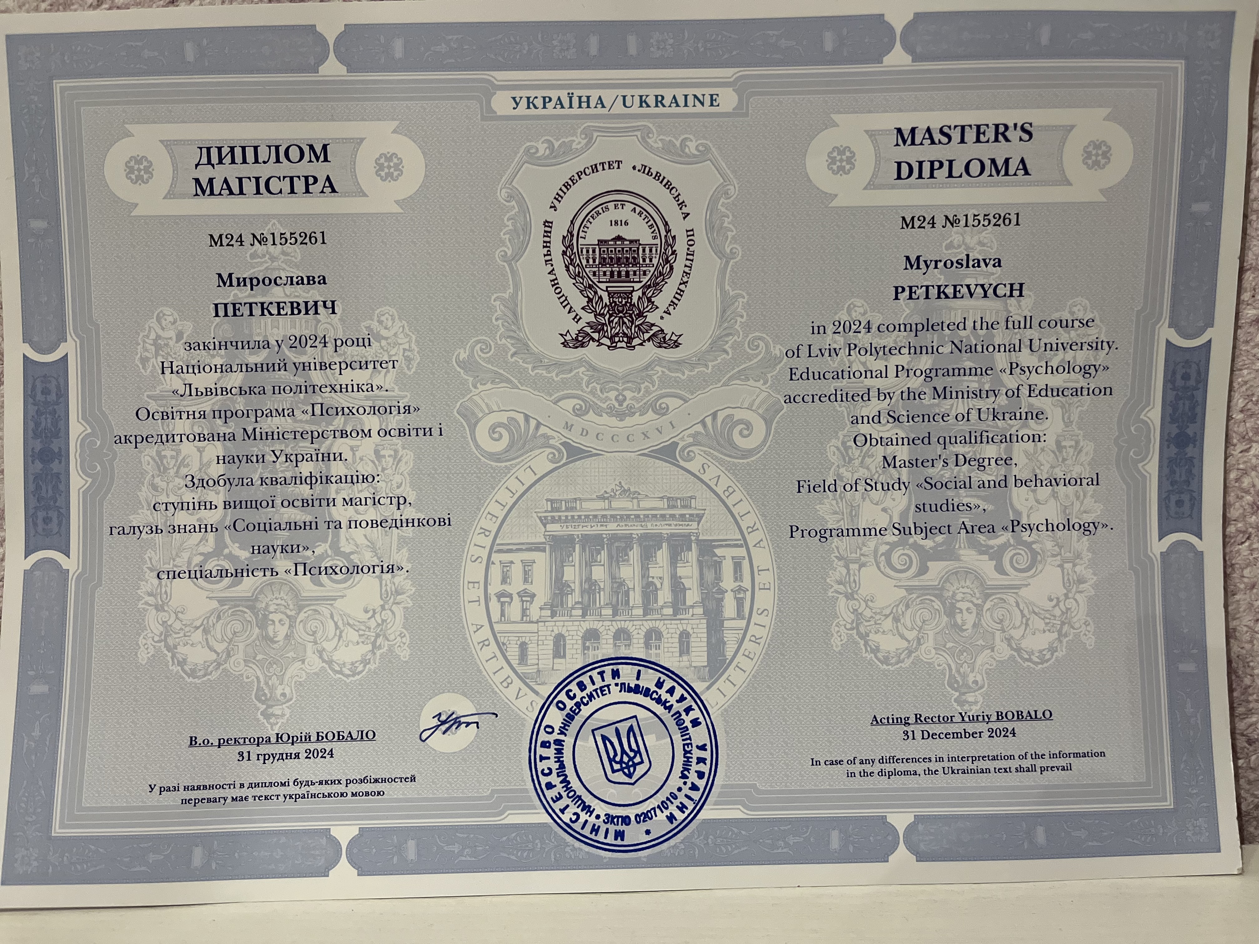 Привіт) Я, Мирослава, дипломований психолог, магістр, закінчила Національний університет Львівська політехніка, за спеціальністю психологія.