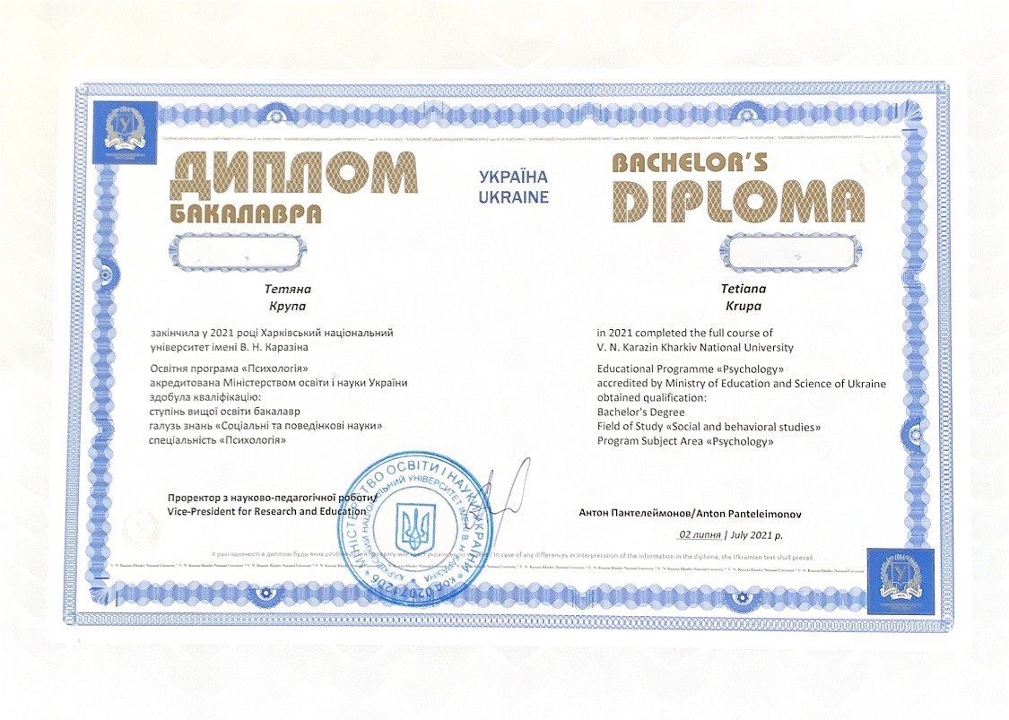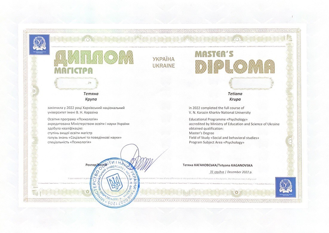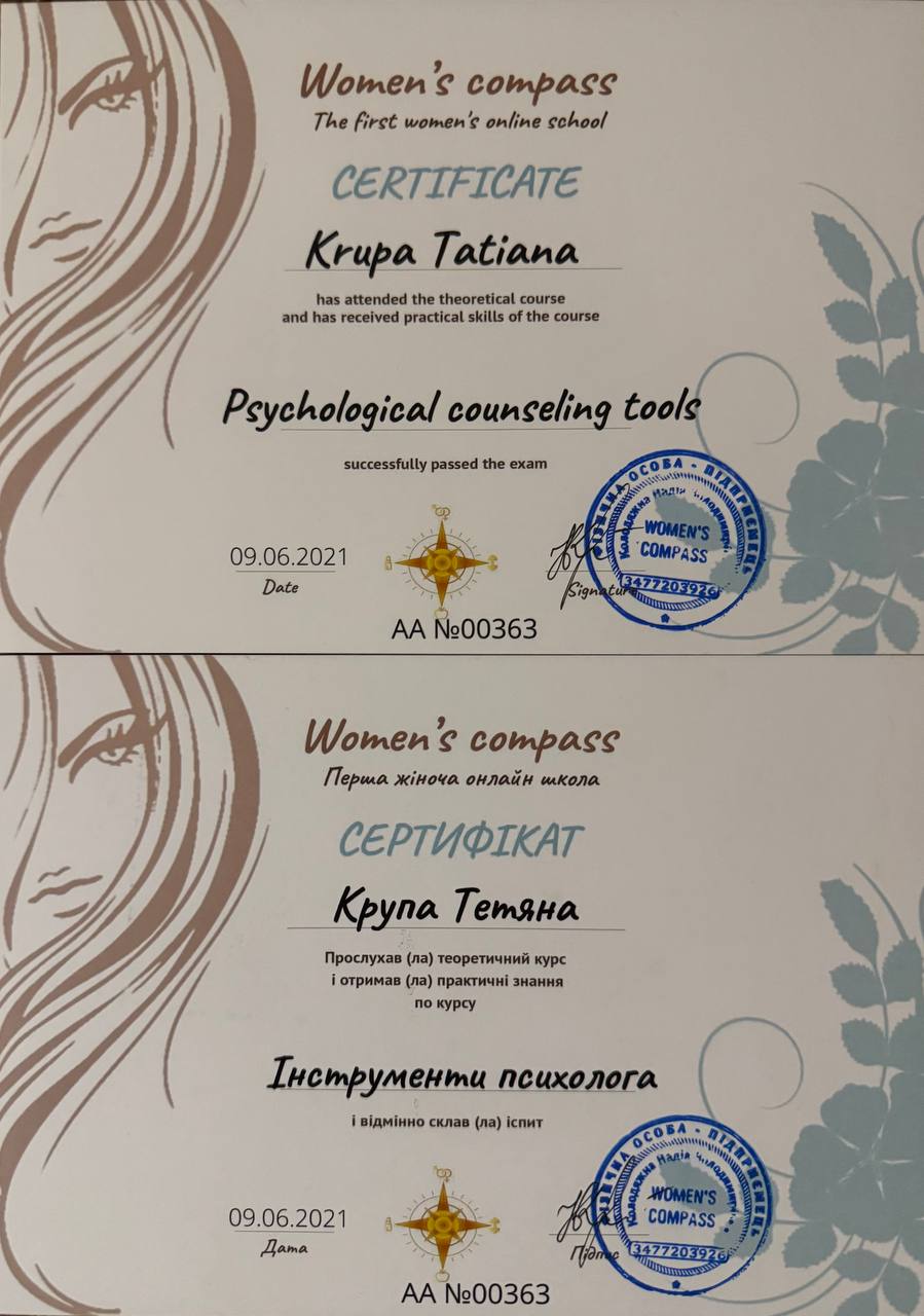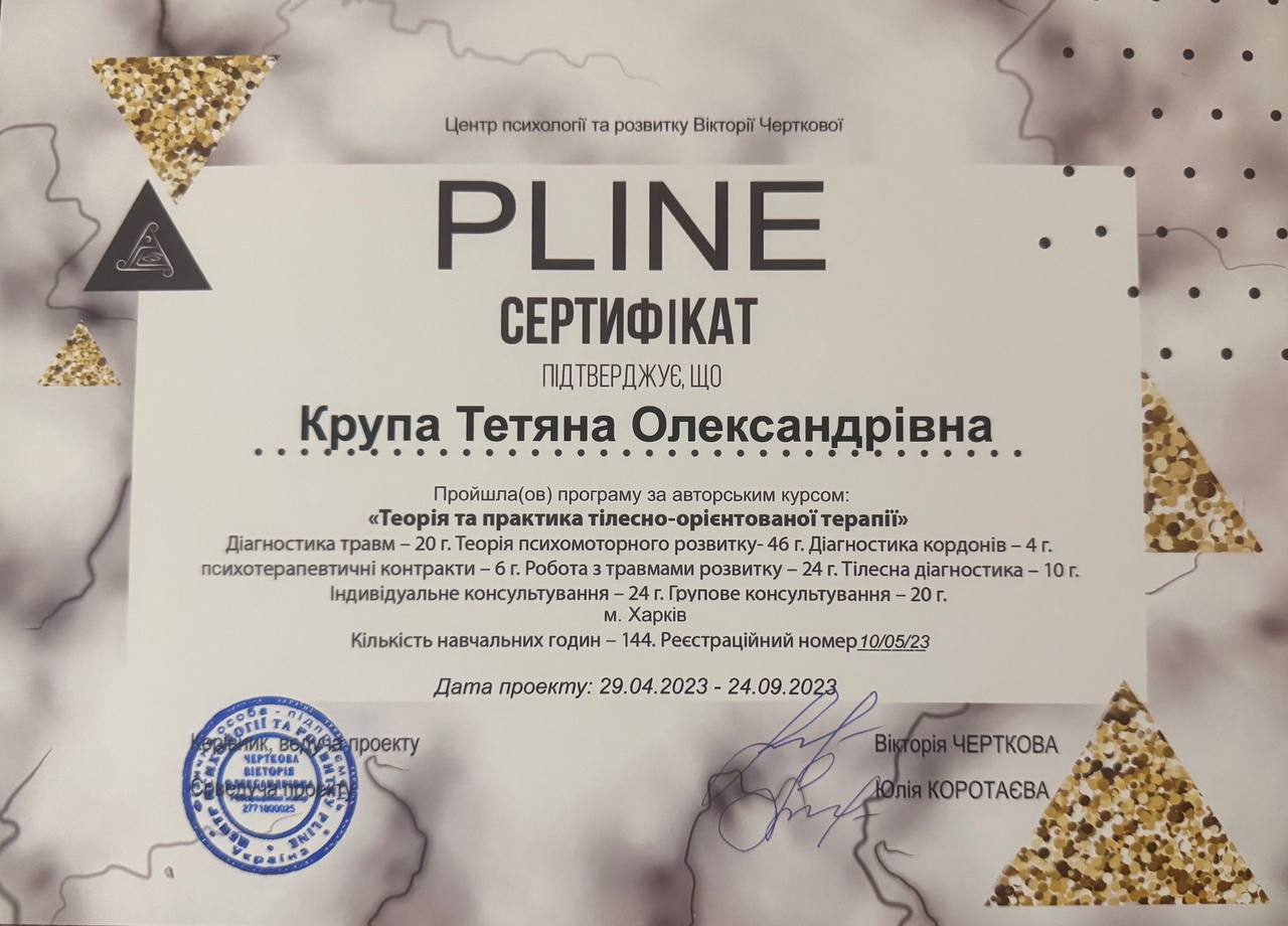 - Сертифікат Теорія та практика тілесно-орієнтованої терапії з 2023 року