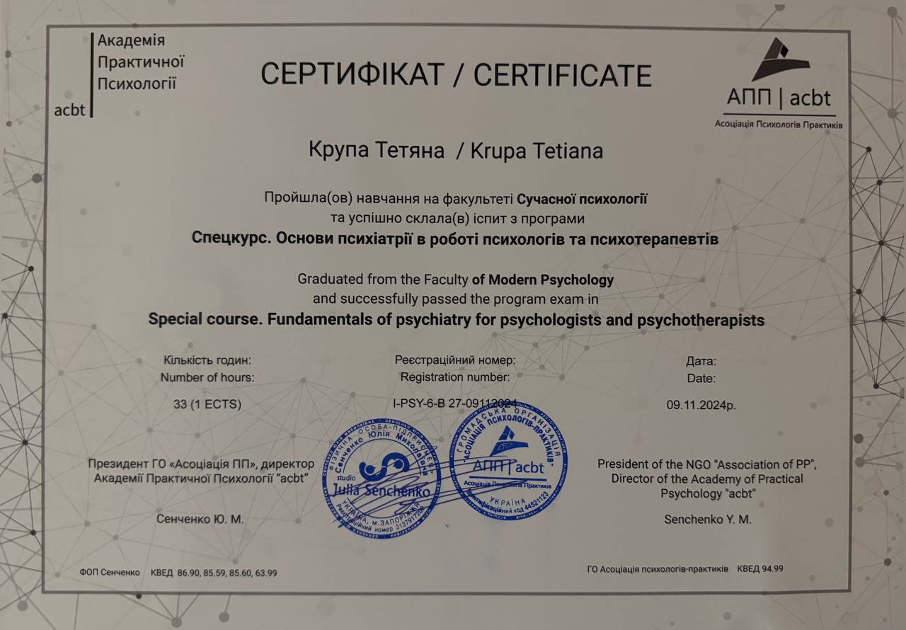 - Сертифікат Основи психіатрії в роботі психологів і психотерапевтів з 2025 року