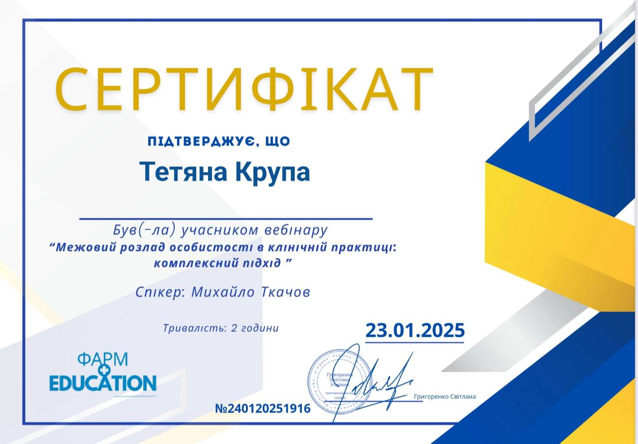 - Сертифікат Межовий розлад особистості в клінічній практиці: комплексний підхід з 2025 року