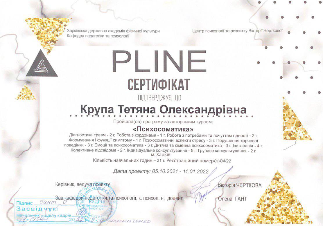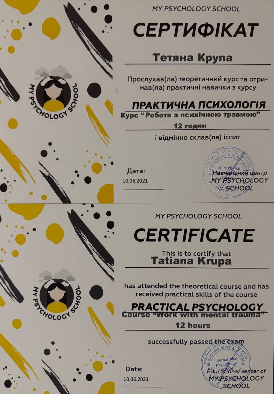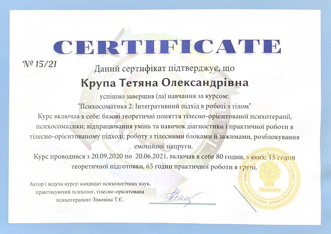 - Сертифікат Психосоматика 2: Інтегративний підхід з 2021 року