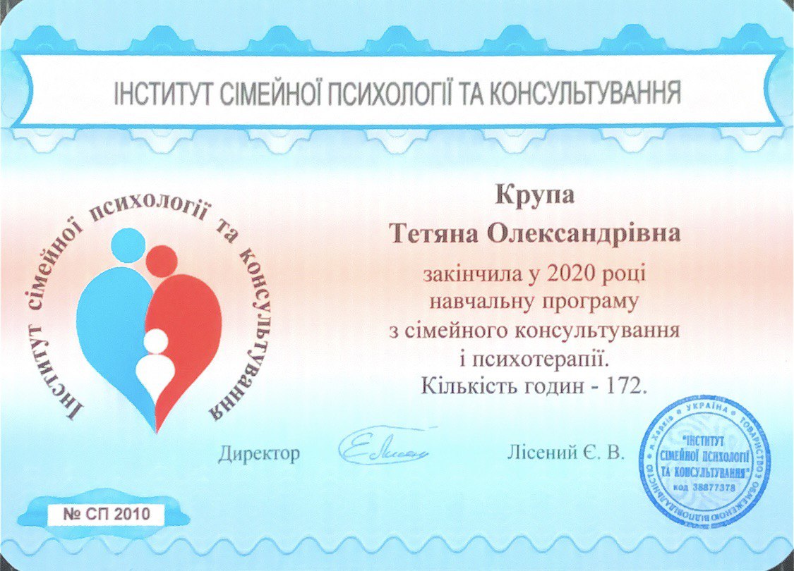 - Сертифікат Навчальна програма з сімейного консультування та терапаї з 2020 року