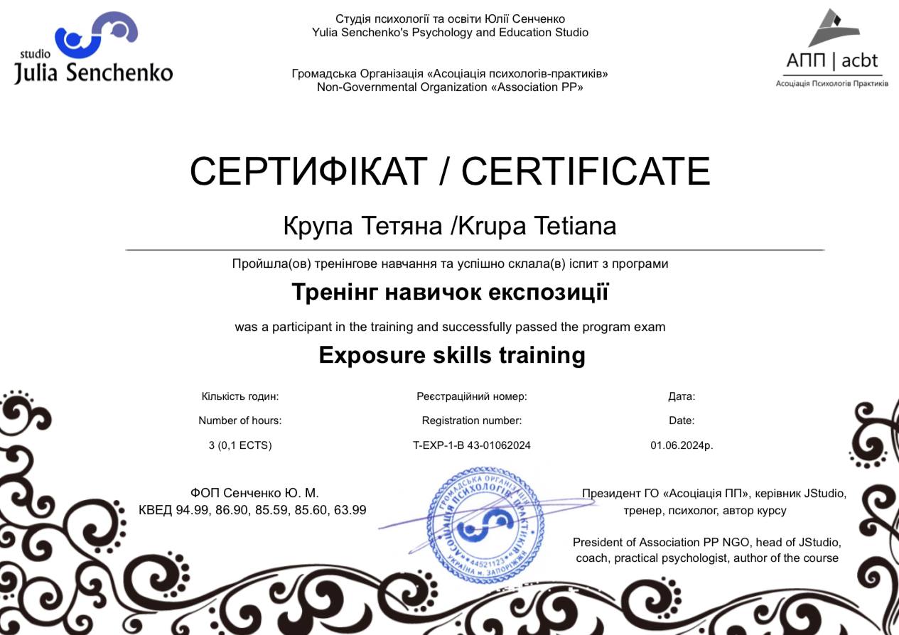 - Сертифікат Тренінг навичок експозиції з 2024 року
