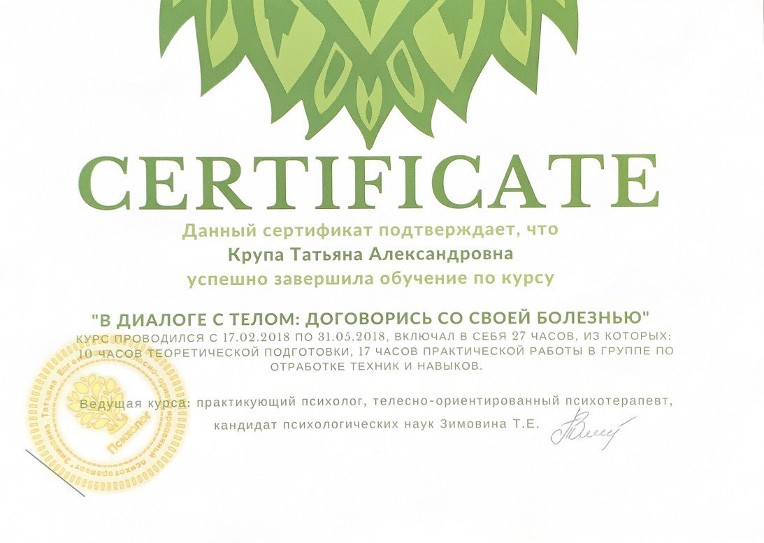 - Сертифікат У діалозі з тілом: домовся зі своєю хворобою з 2018 року