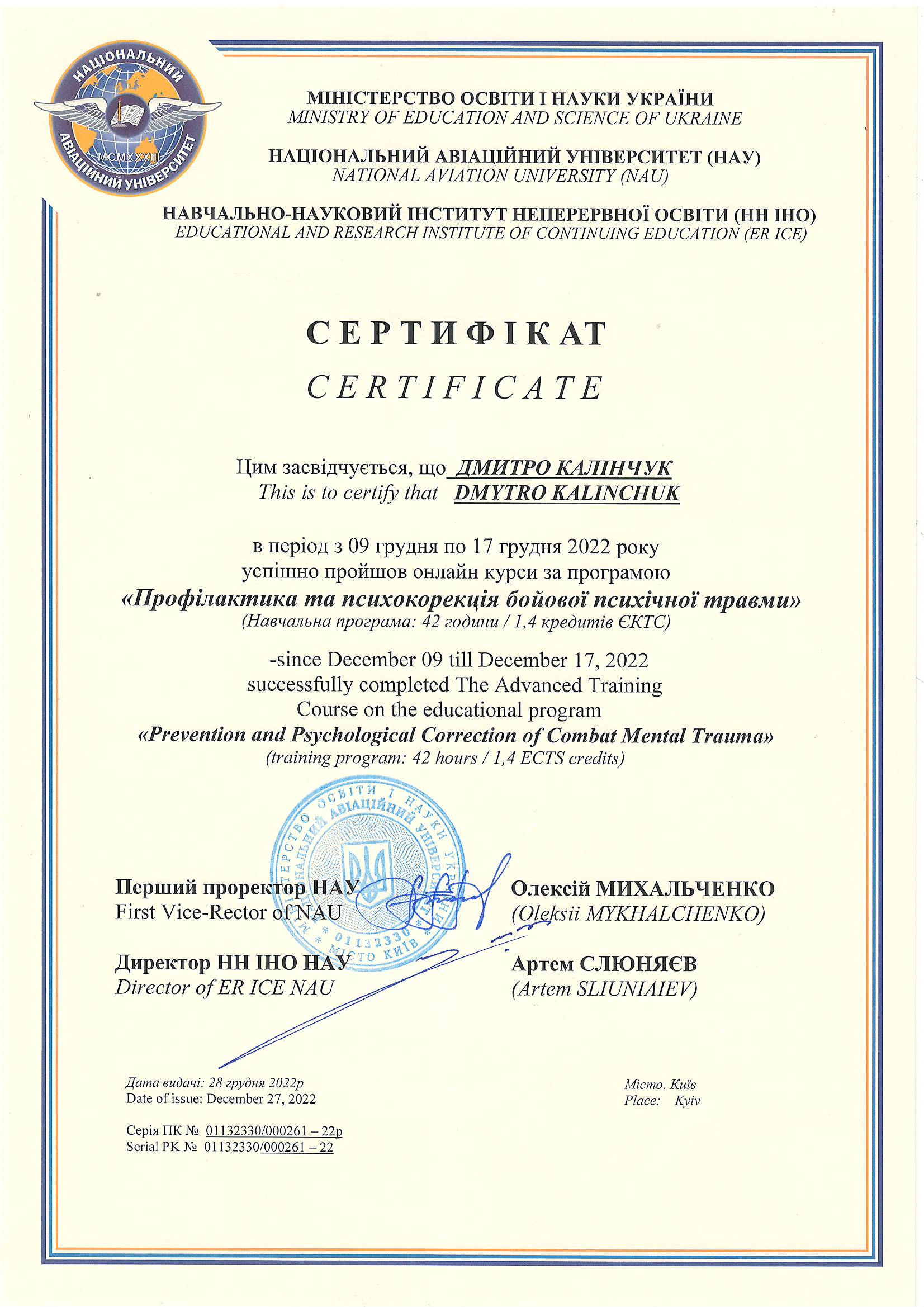 - Сертифікат Національний авіаційний університет, курс «Профілактика та психокорекція бойової психічної травми». з 2022 року