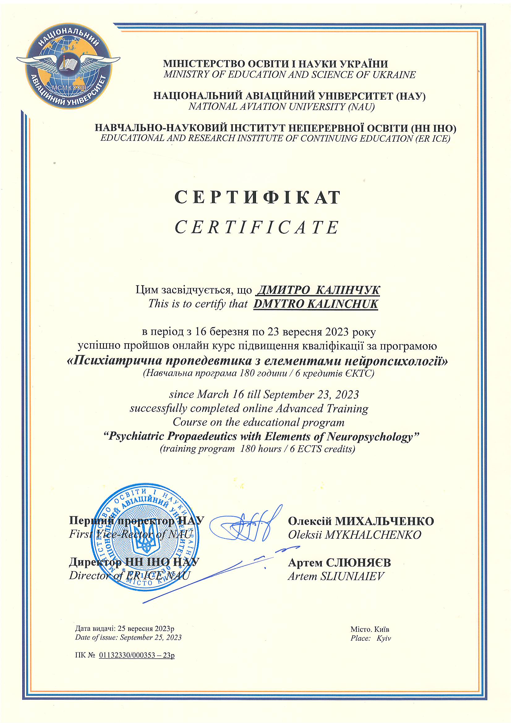 - Сертифікат Національний авіаційний університет, курс підвищення кваліфікації за програмою «Психіатрична пропедевтика з елементами нейропсихології». з 2023 року