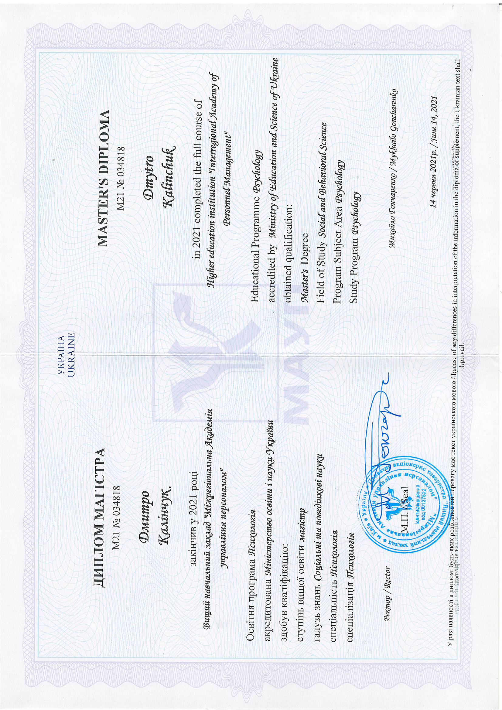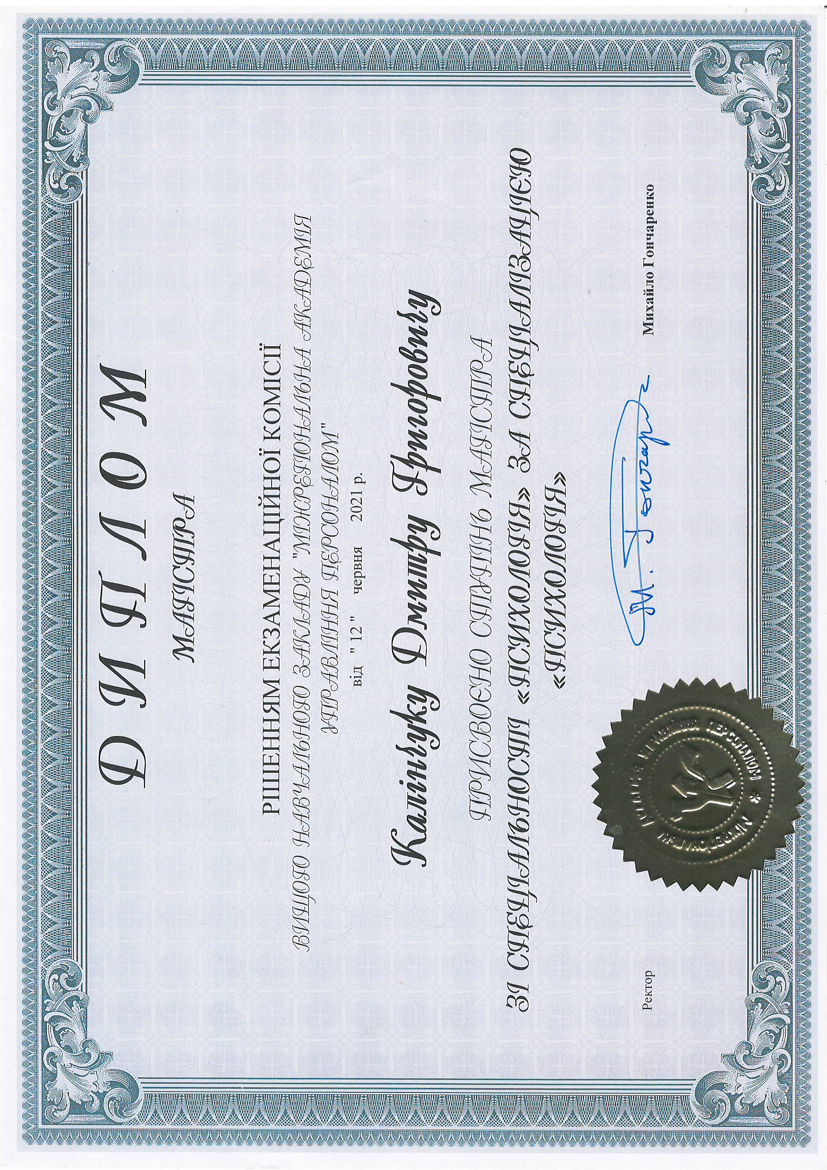 - Вищий навчальний заклад «Міжрегіональна Академія управління персоналом», ступінь вищої освіти – магістр, спеціальність – психологія, спеціалізація – психологія. в 2021