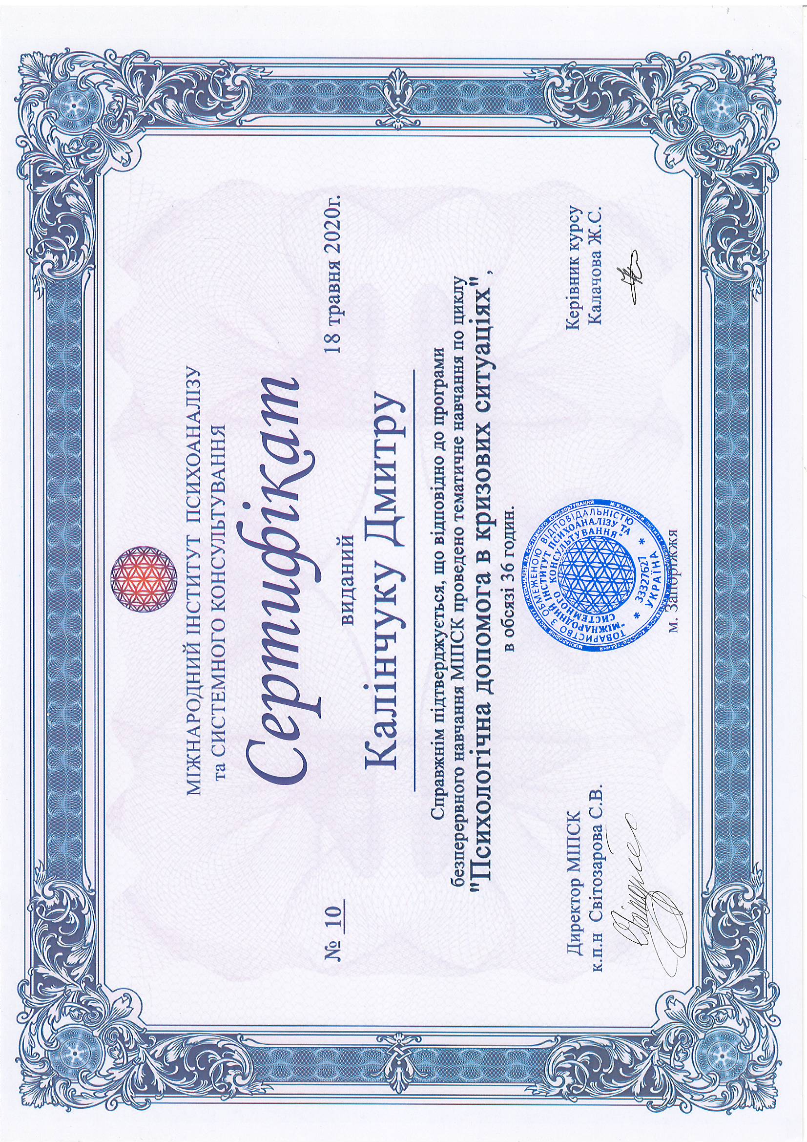 - Сертифікат Міжнародний інститут психоаналізу та системного консультування, тематичне навчання «Психологічна допомога в кризових ситуаціях» з 2020 року