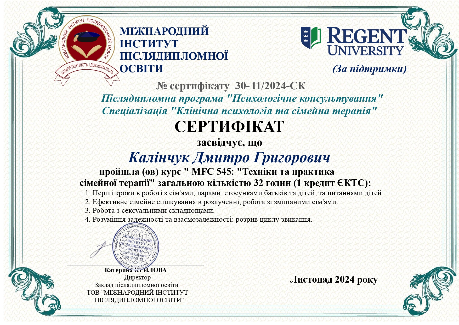 - Сертифікат Міжнародний інститут післядипломної освіти, курс «Техніка та практика сімейної терапії». з 2024 року