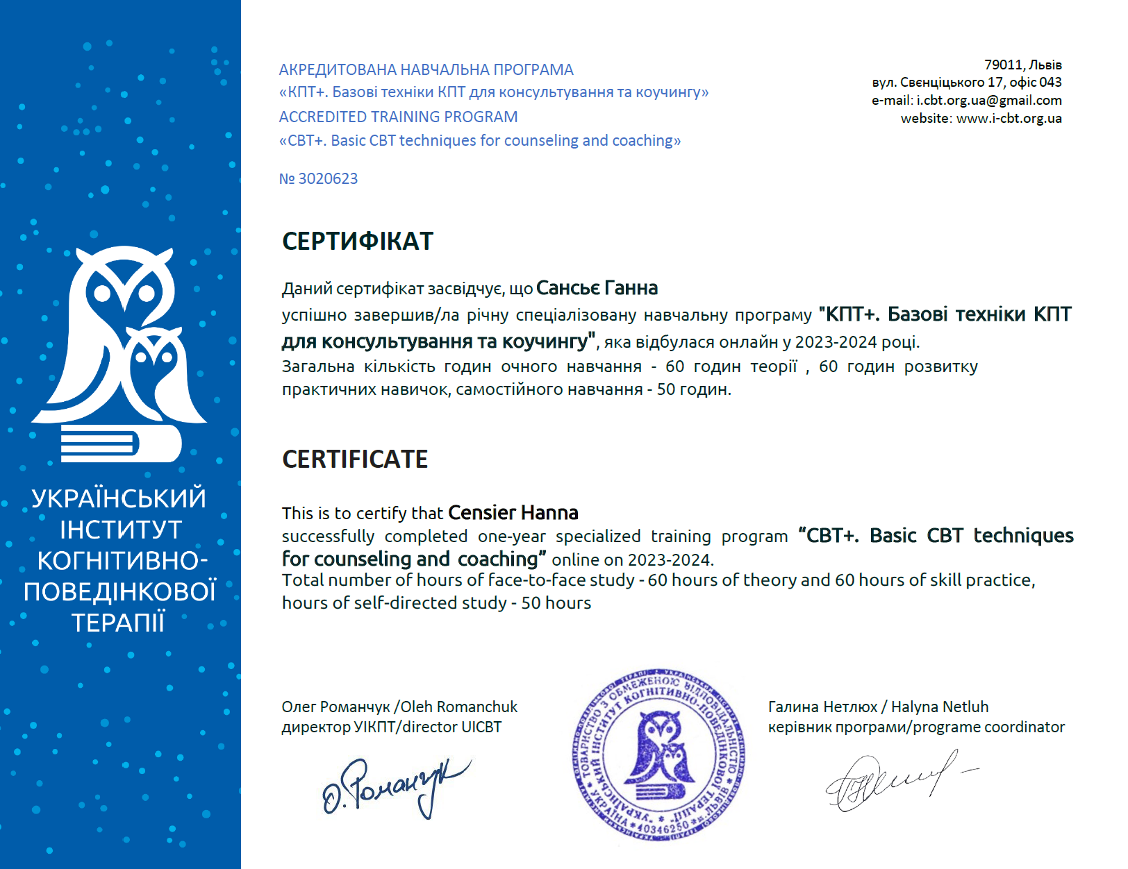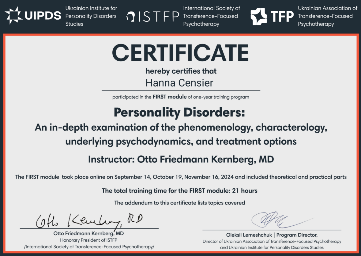 Мій професійний інтерес — допомагати людям краще розуміти себе, знаходити внутрішню опору та навчатися жити в автентичності. Найчастіше виявляється, що з тобою все справді гаразд, і навіть короткострокова терапія може принести відчутні результати. А якщо відкривається щось складніше — це також цінно, бо дає можливість зрозуміти себе глибше і знайти способи допомогти собі.