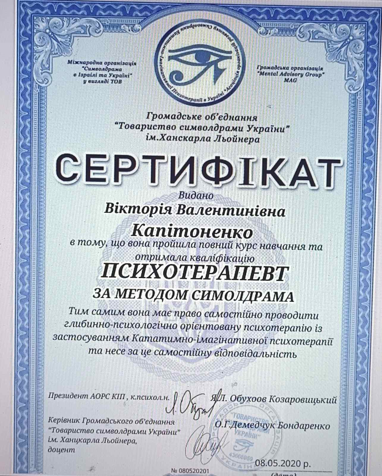 - Сертифікат ПСИХОТЕРАПЕВТ ЗА МЕТОДОМ СИМОЛДРАМА з 2020 року