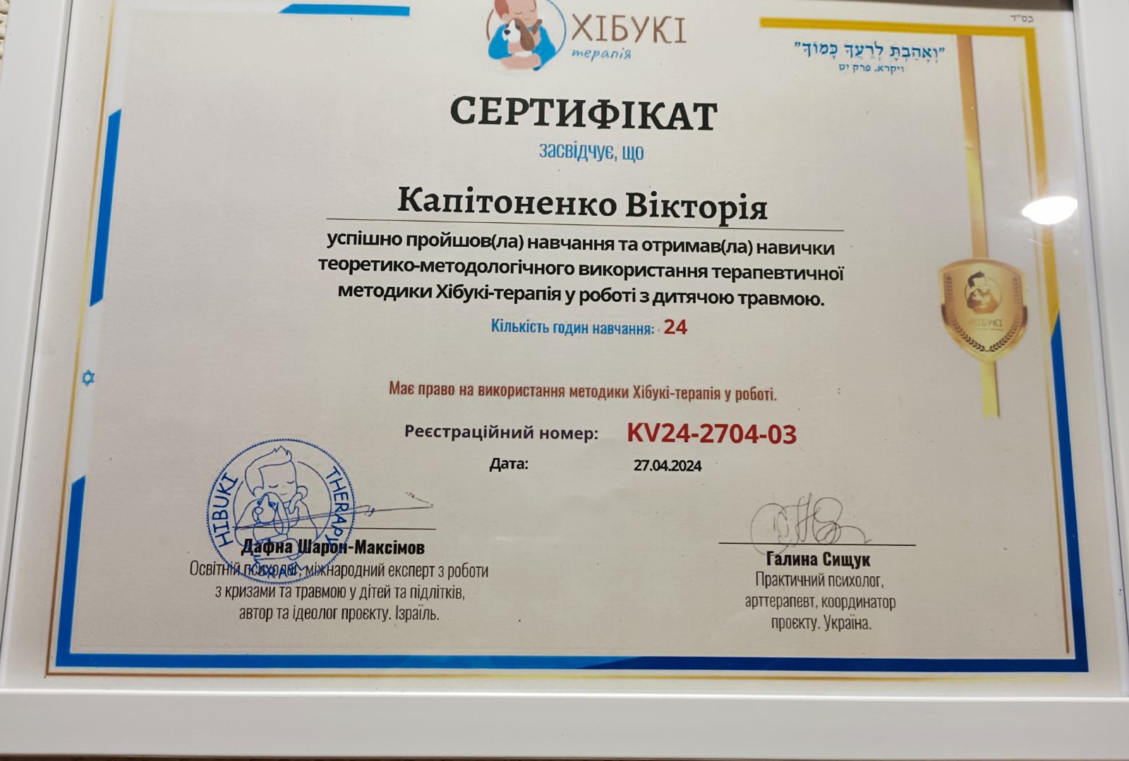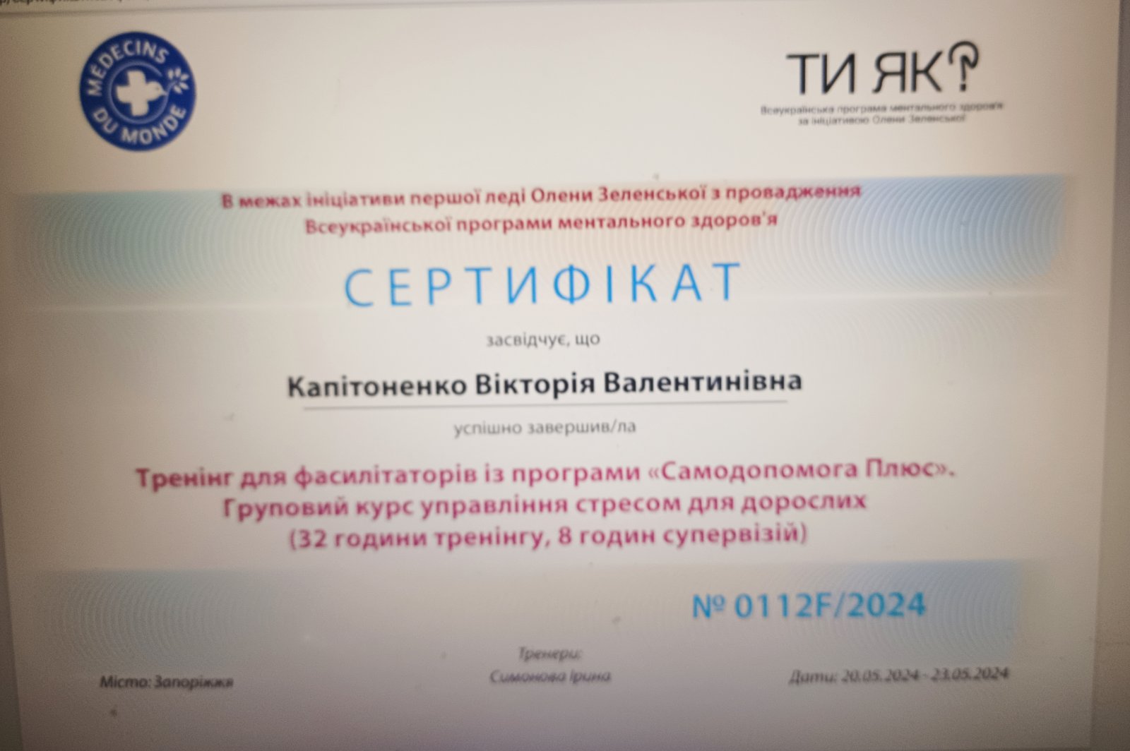 - Сертифікат Основм когнітивно-поведінкової терапії з 2024 року