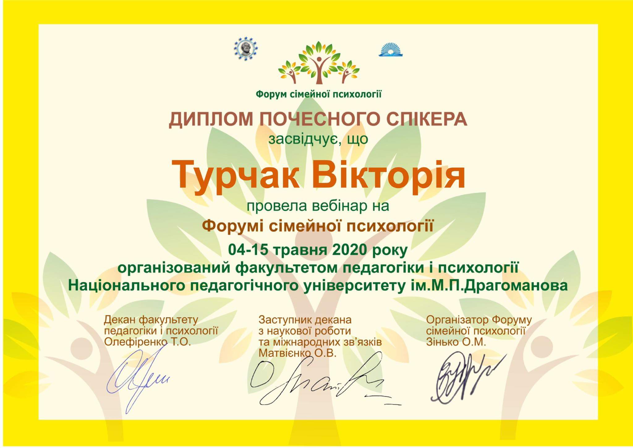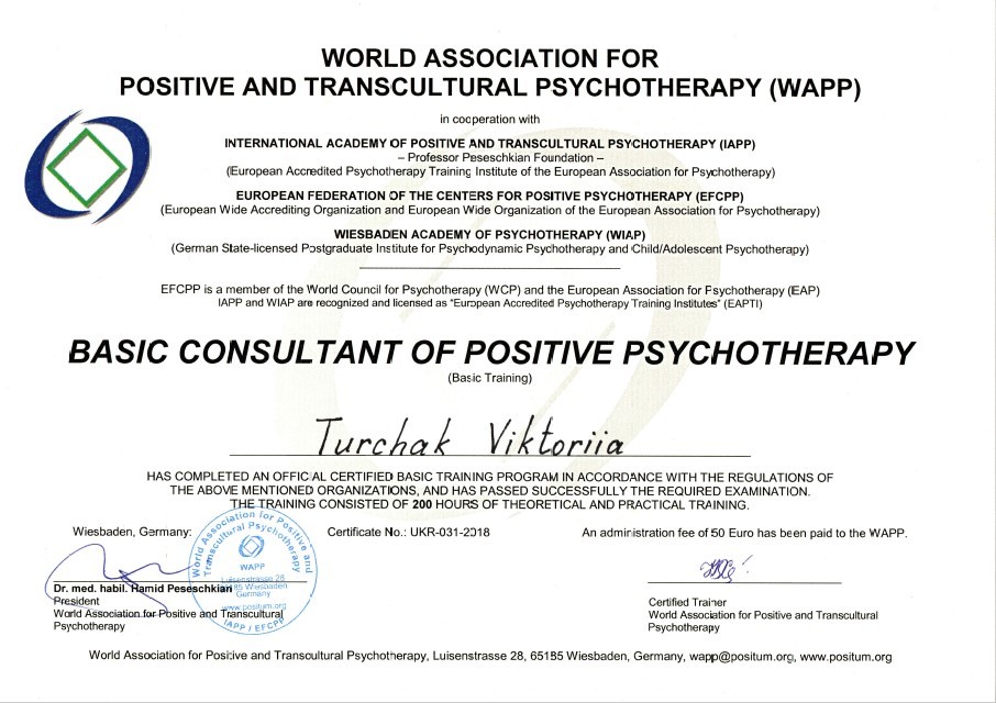 - Сертифікат Консультант в методі позитивної психотерапії з 2018 року