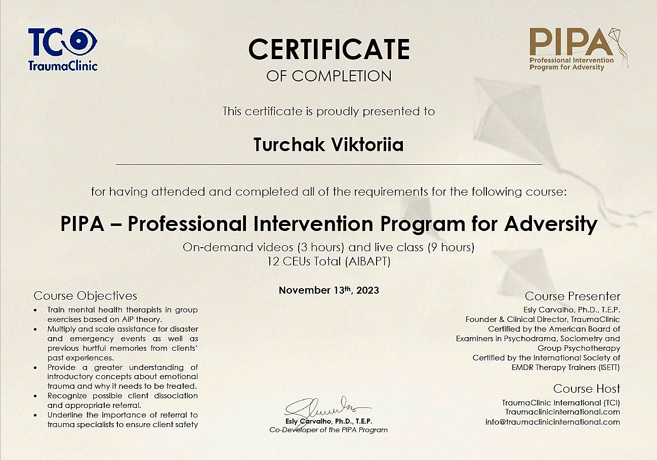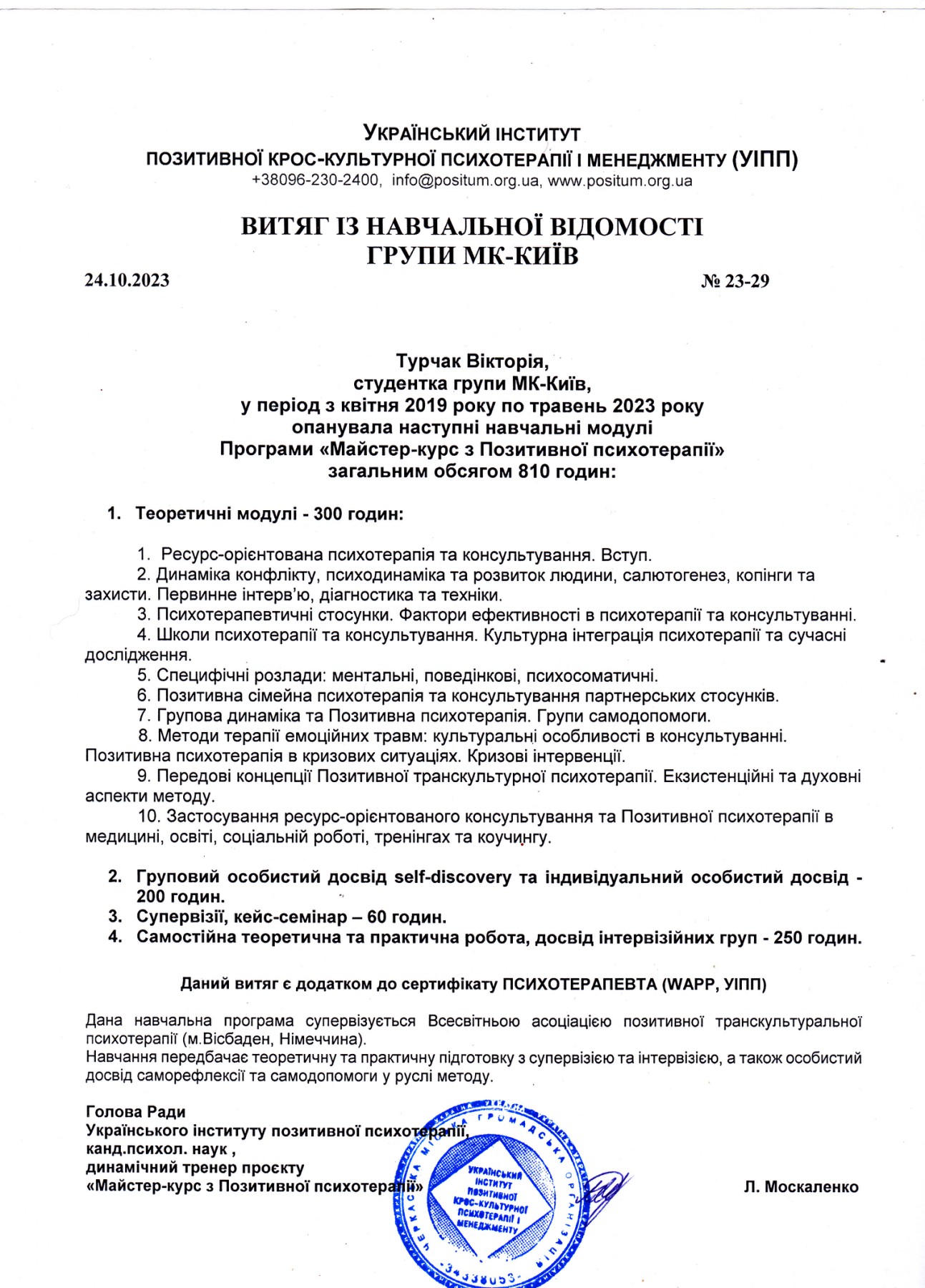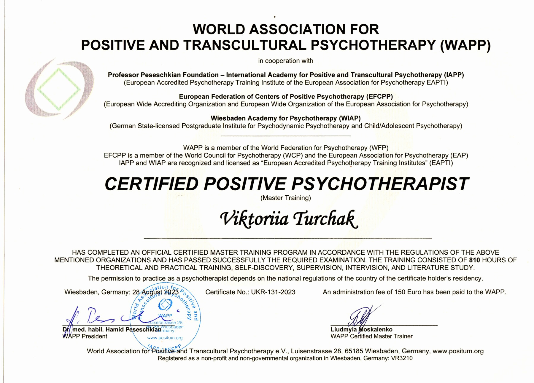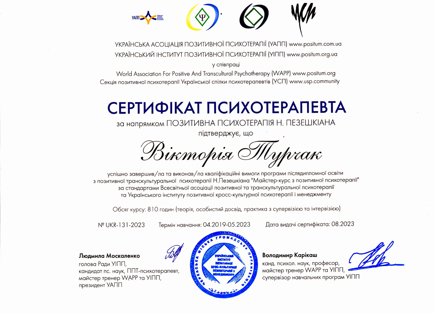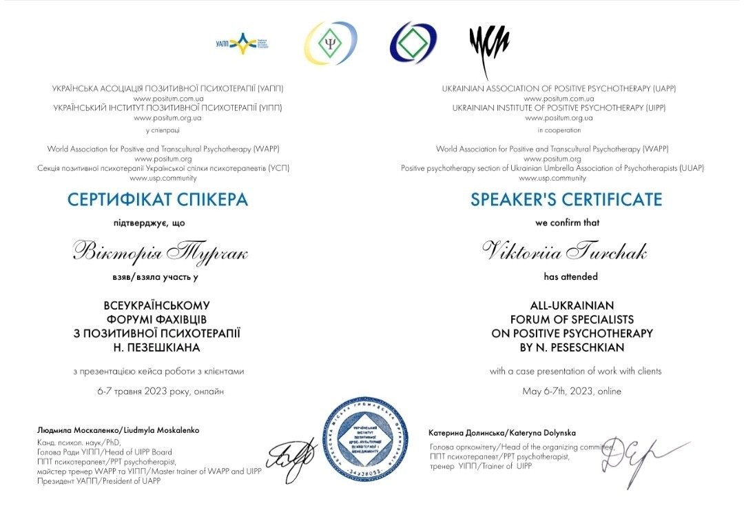 - Сертифікат Психотерапевт в методі позитивної психотерапії з 2023 року