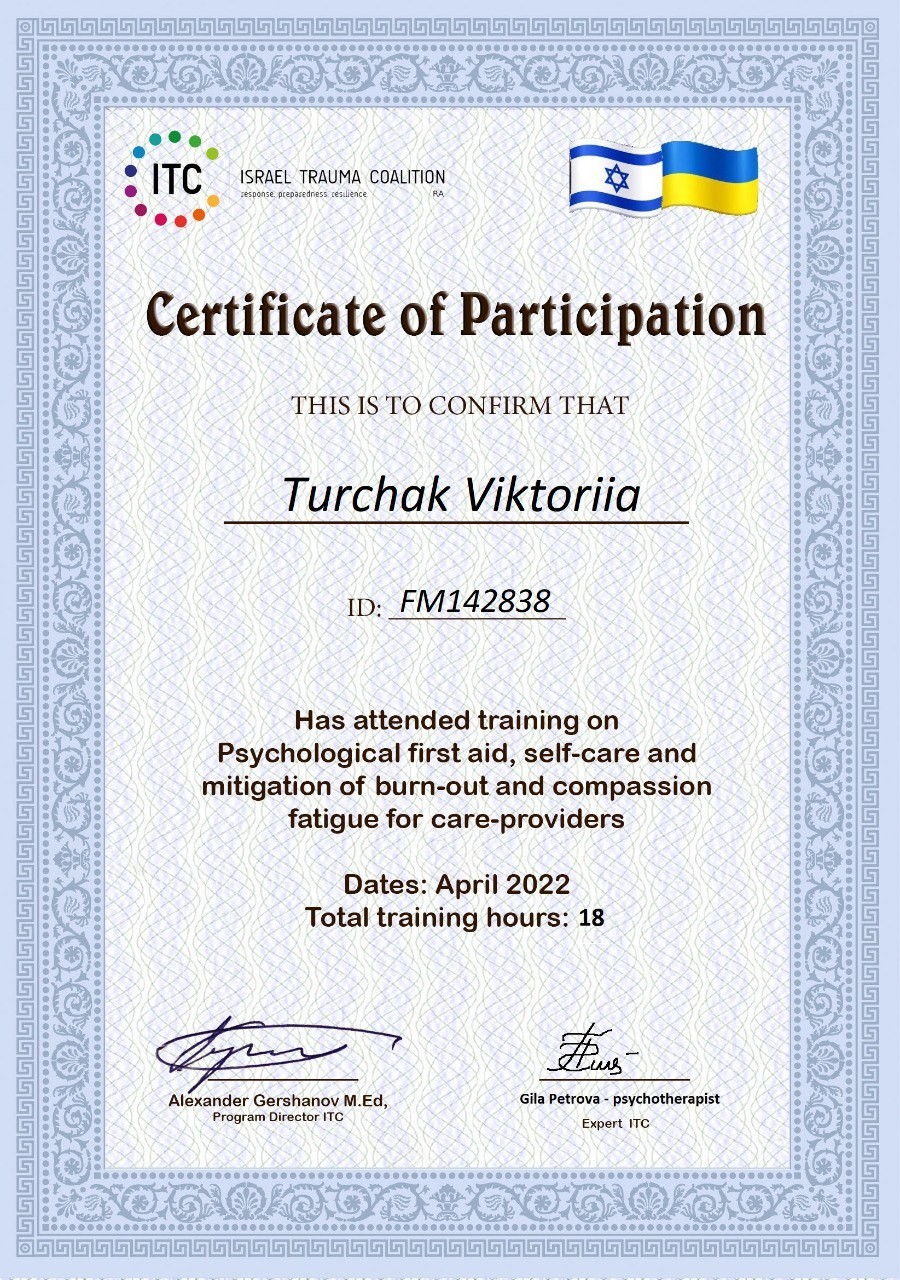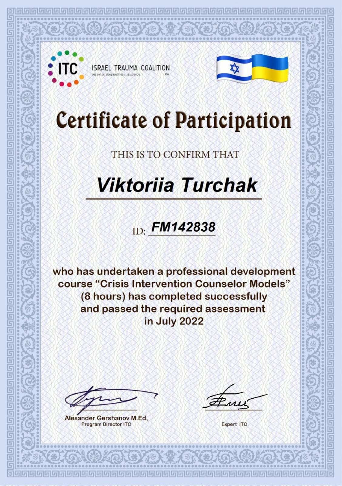 - Сертифікат Перша психологічна допомога та профілактика вигорання, Кризові втручання з 2022 року