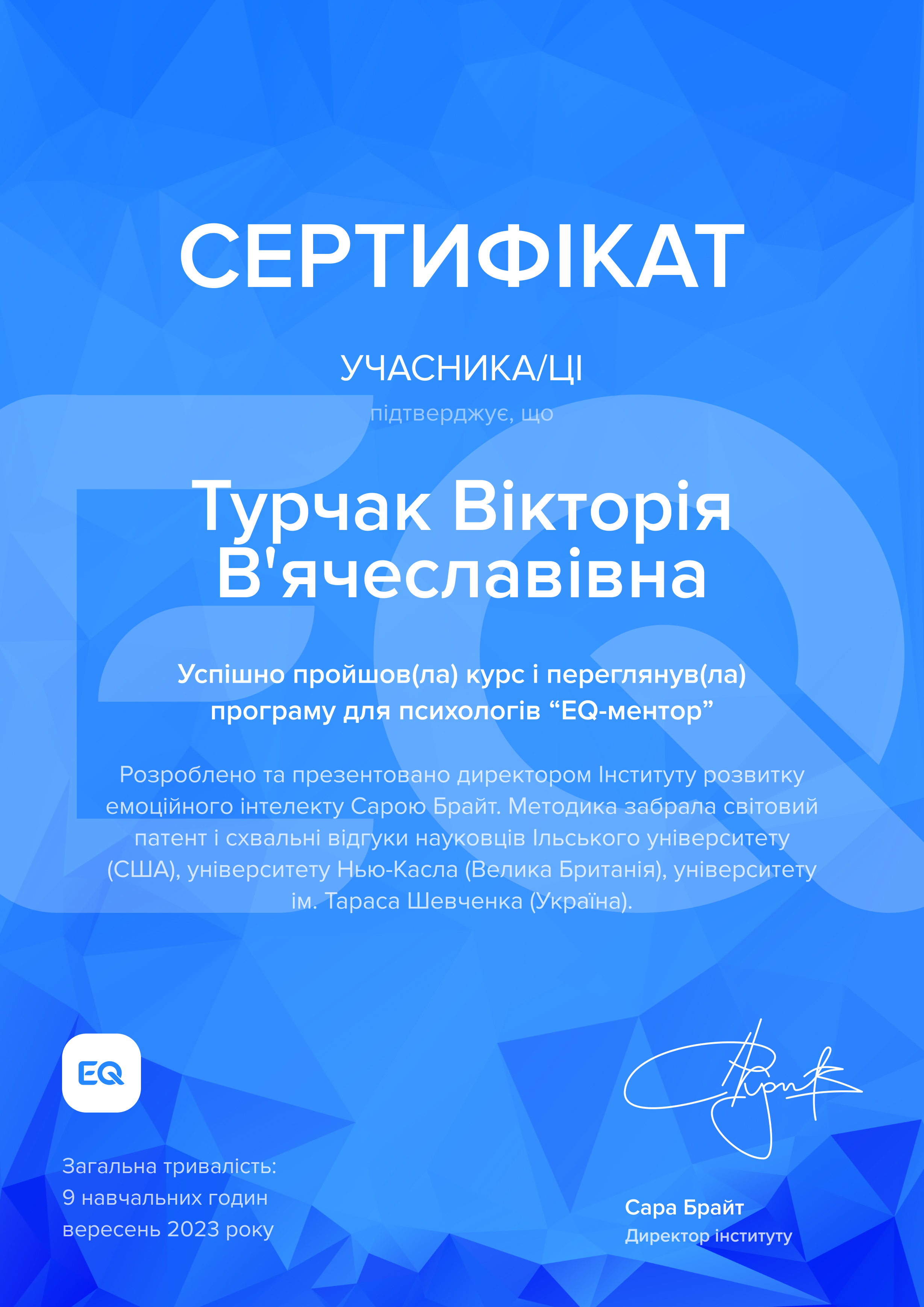 - Сертифікат Програма для психологів EQ-ментор з 2023 року
