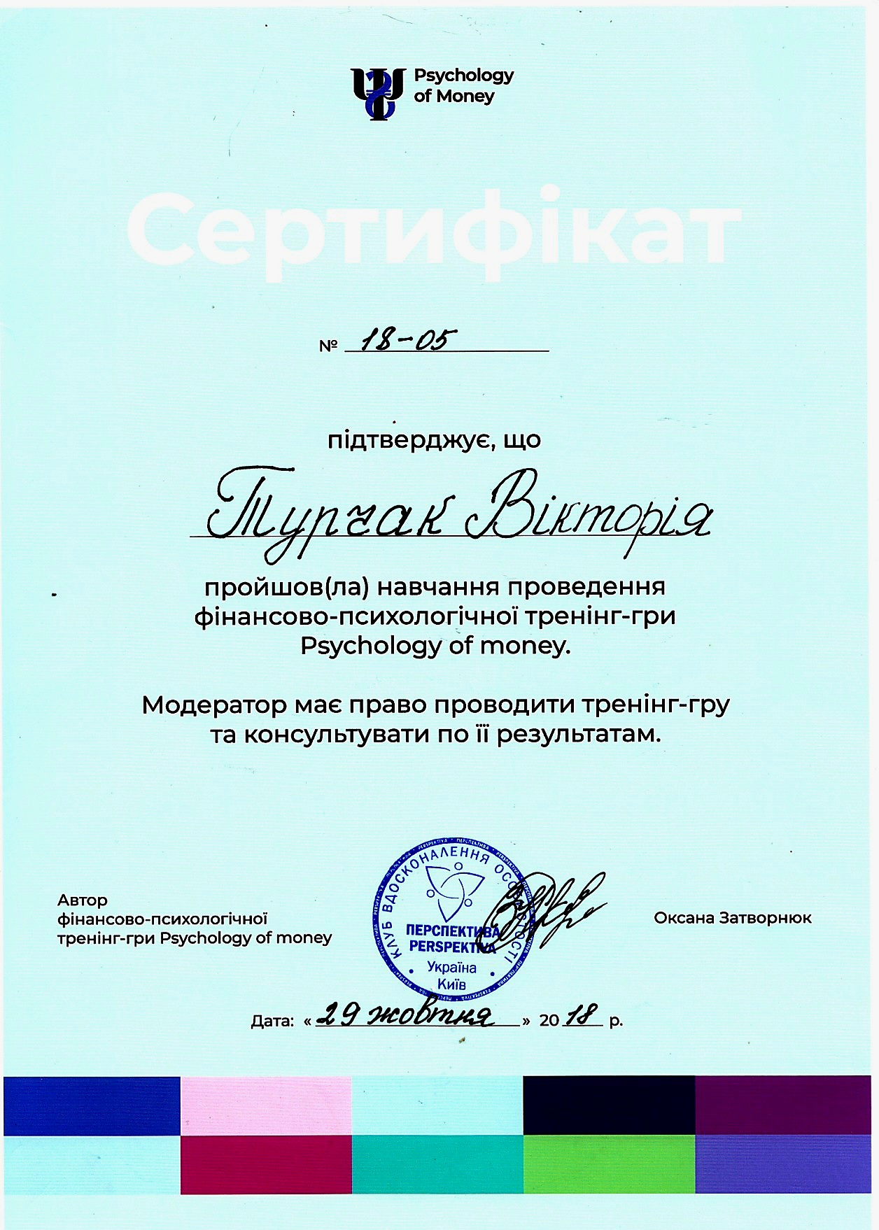 - Сертифікат Модератор психологічно-фінансової гри з 2018 року