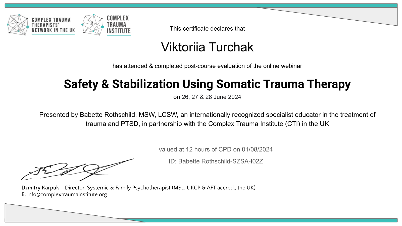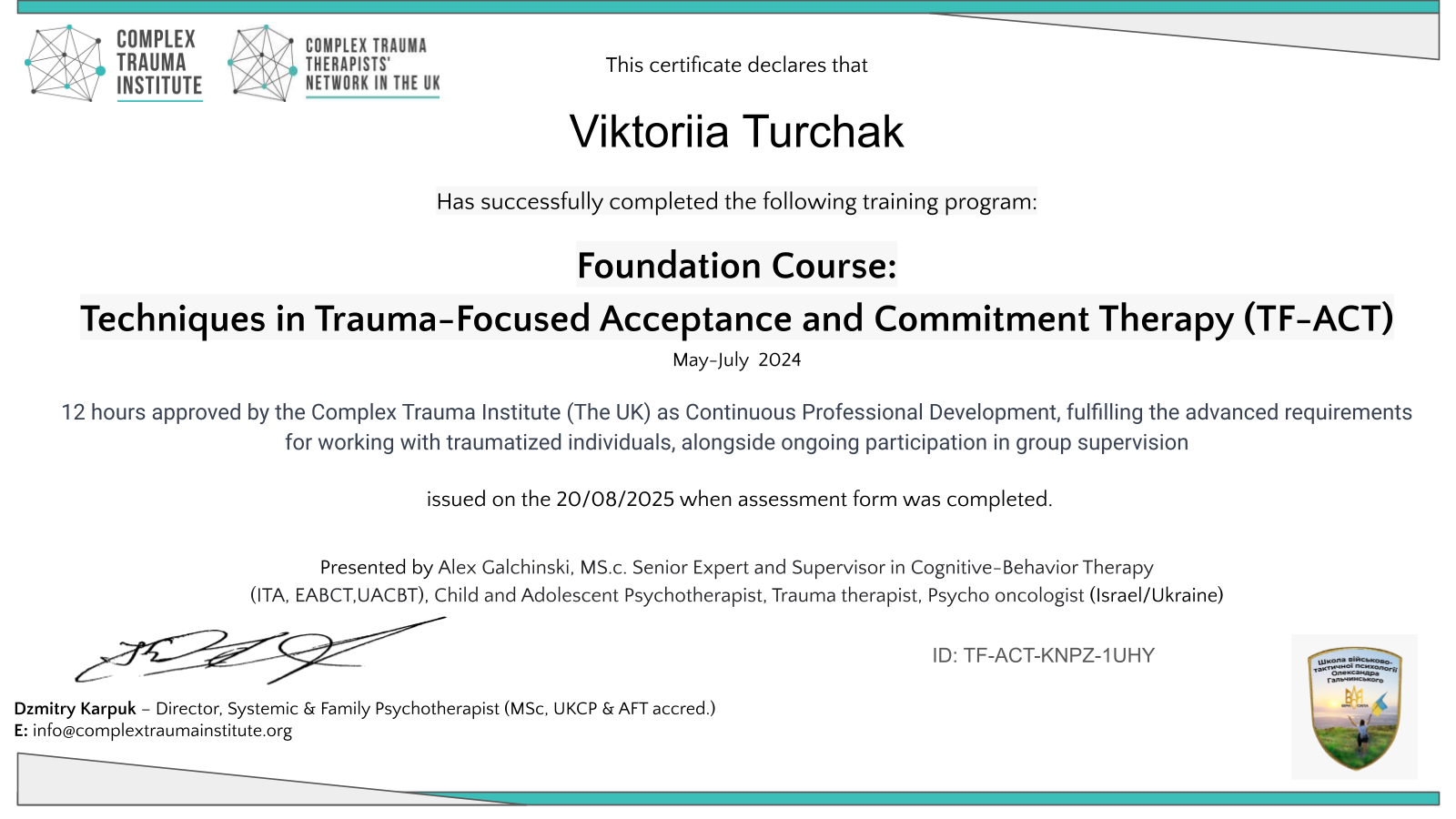- Сертифікат Травмофокусована терапія прийняття та відповідальності з 2025 року