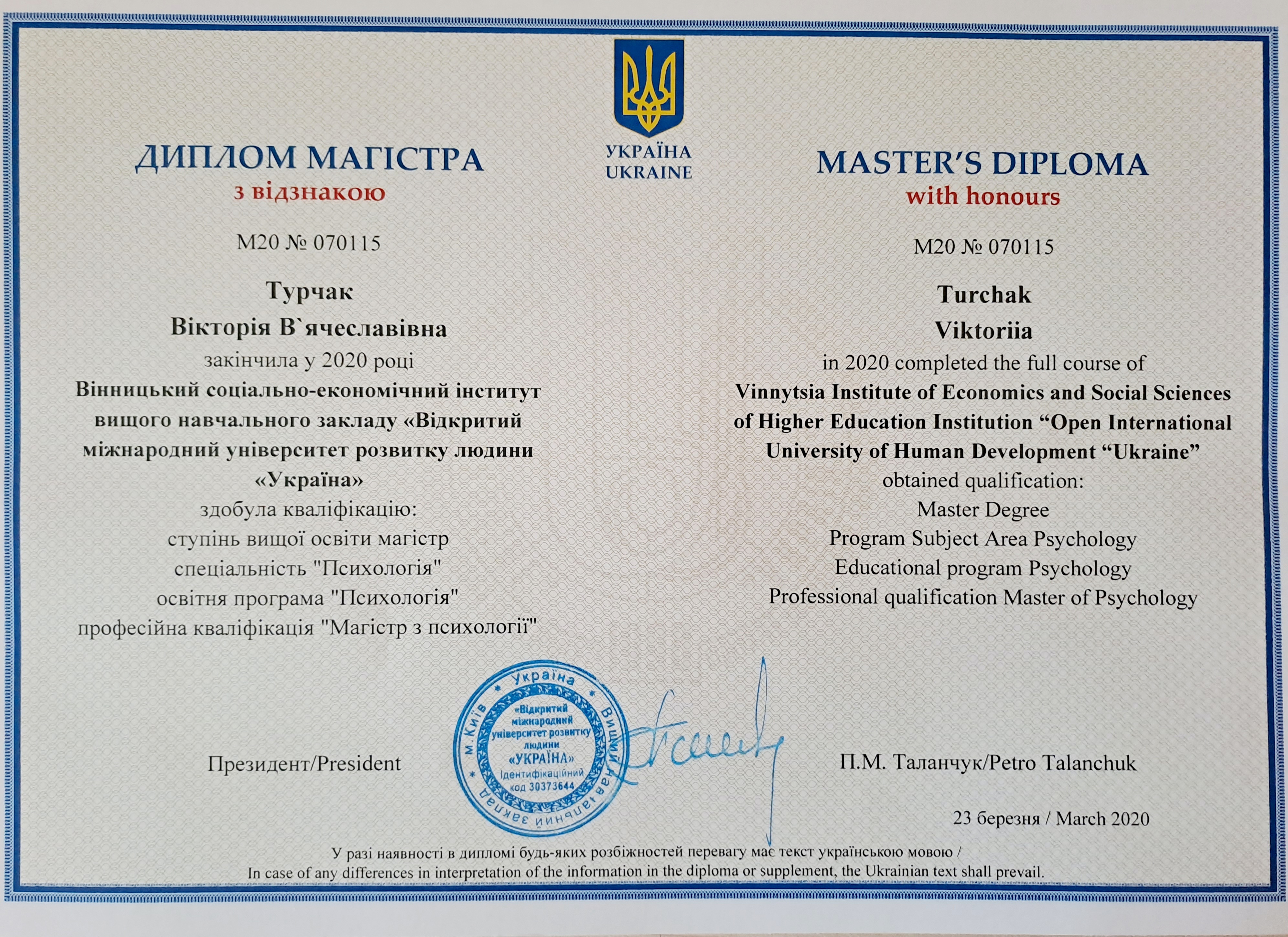 - Вінницький соціально-економічний інститут Університету "Україна", магістр психології в 2020